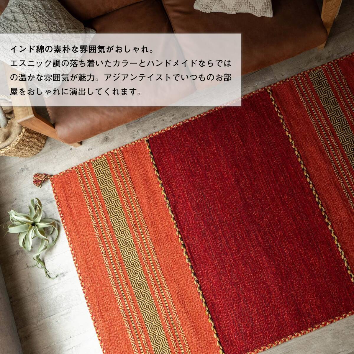 エスニックなデザインと手織りならではの素朴な雰囲気が味わい感じるおしゃれなコットンラグ。