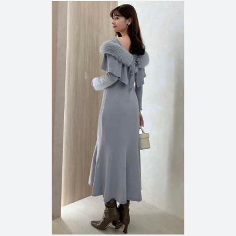 エレガントさとトレンド感が融合された、華やかなマーメイドニットドレス。, 身体のラインを拾いにくい適度な肉感のリブ編みは着心地も良く、しっかりと暖かいのが特徴。ファーは前後ろどちらでもご着用いただけます。リボンの位置で表情が変わるため、シーンに合わせてお好みでお楽しみください。