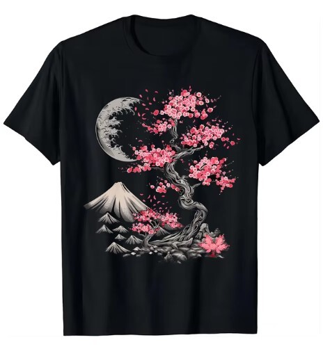 男性用Tシャツ、ストリートウェア、デザイン:桜、三日月、富士 A