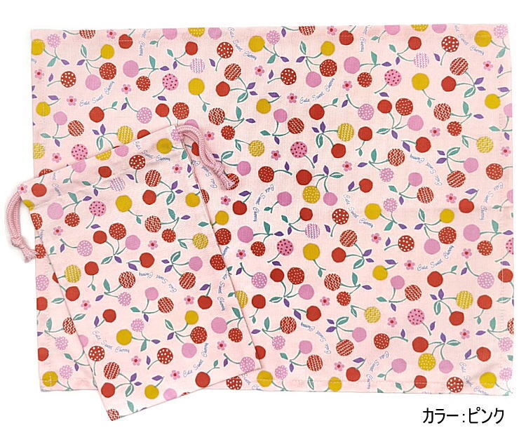 給食袋(巾着袋MS)+ナフキン(長方形) 2点セット【北欧風 ポップチェリー柄 ピンク】ランチクロス コップ袋 はし袋 箸袋 ポーチ 日本製
