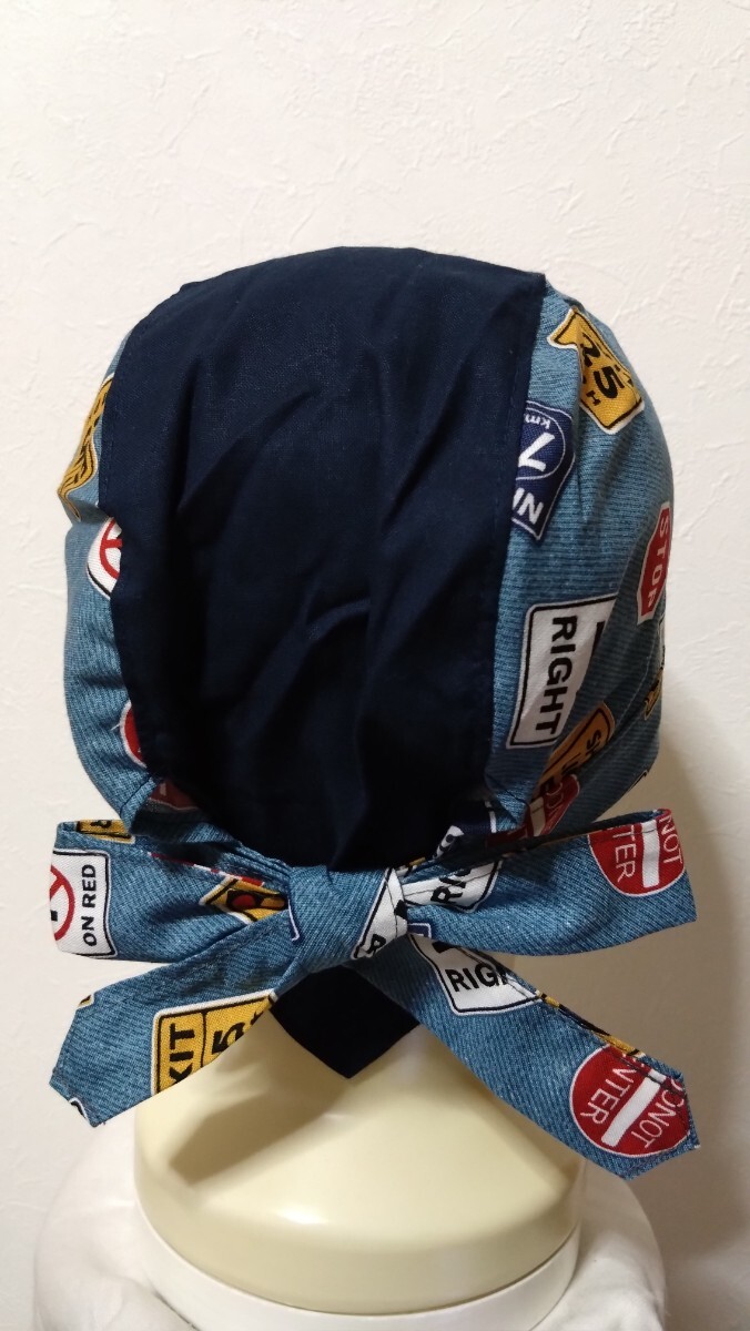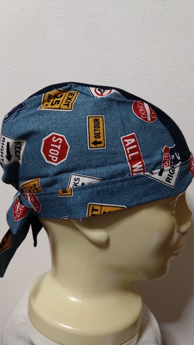 短★バンダナキャップ★ハンドメイド 道路標識×無地 ブルーグレー