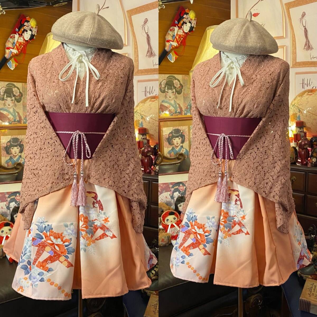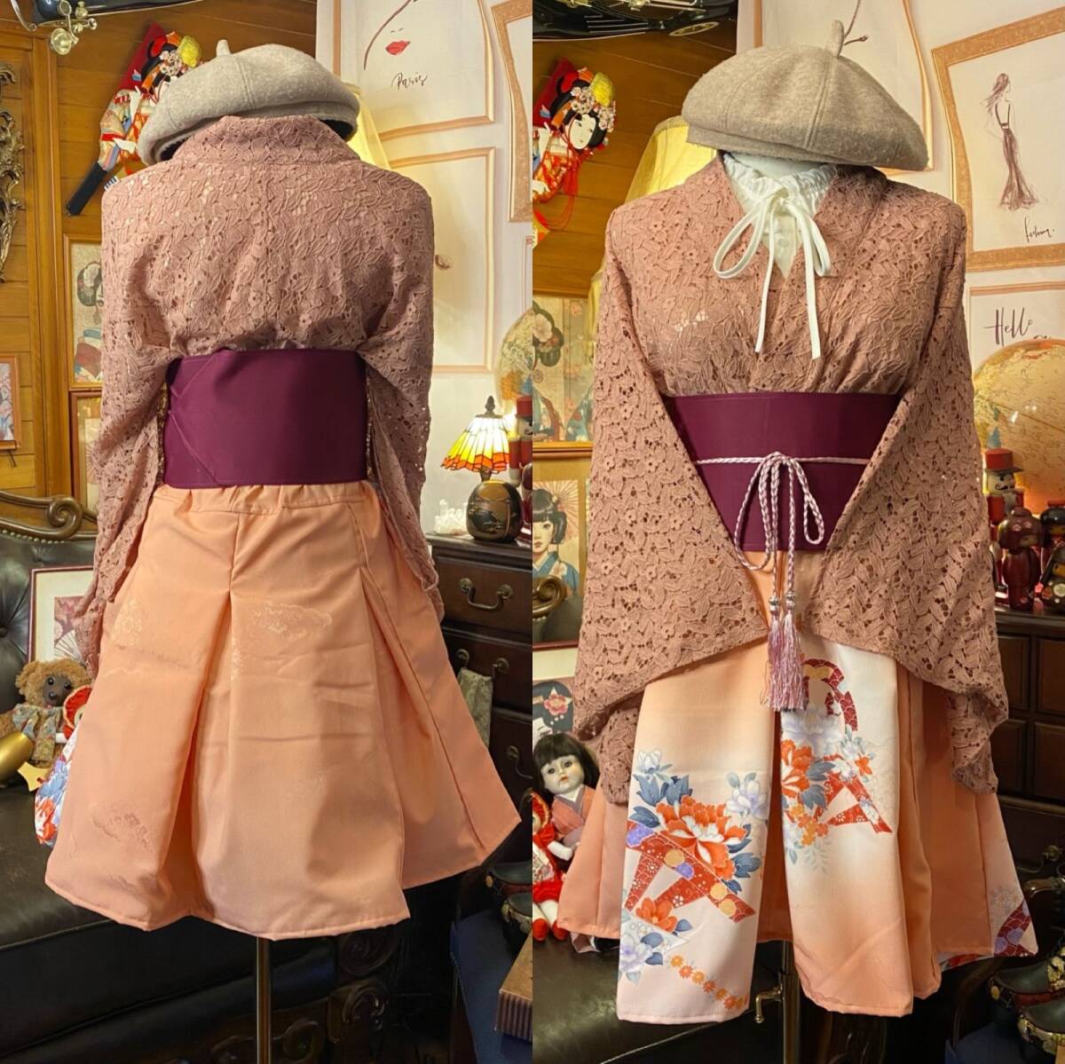 【和ロリ 着物 浴衣 ミニ丈 ワンピース ドレス 名古屋帯サッシュベルト リメイク 和 ハンドメイド レトロ 古着 優しいくすみピンクと華やかな和柄が絶妙に融合した、女性らしさとエレガンスを兼ね備えた一着 MKW-27 】