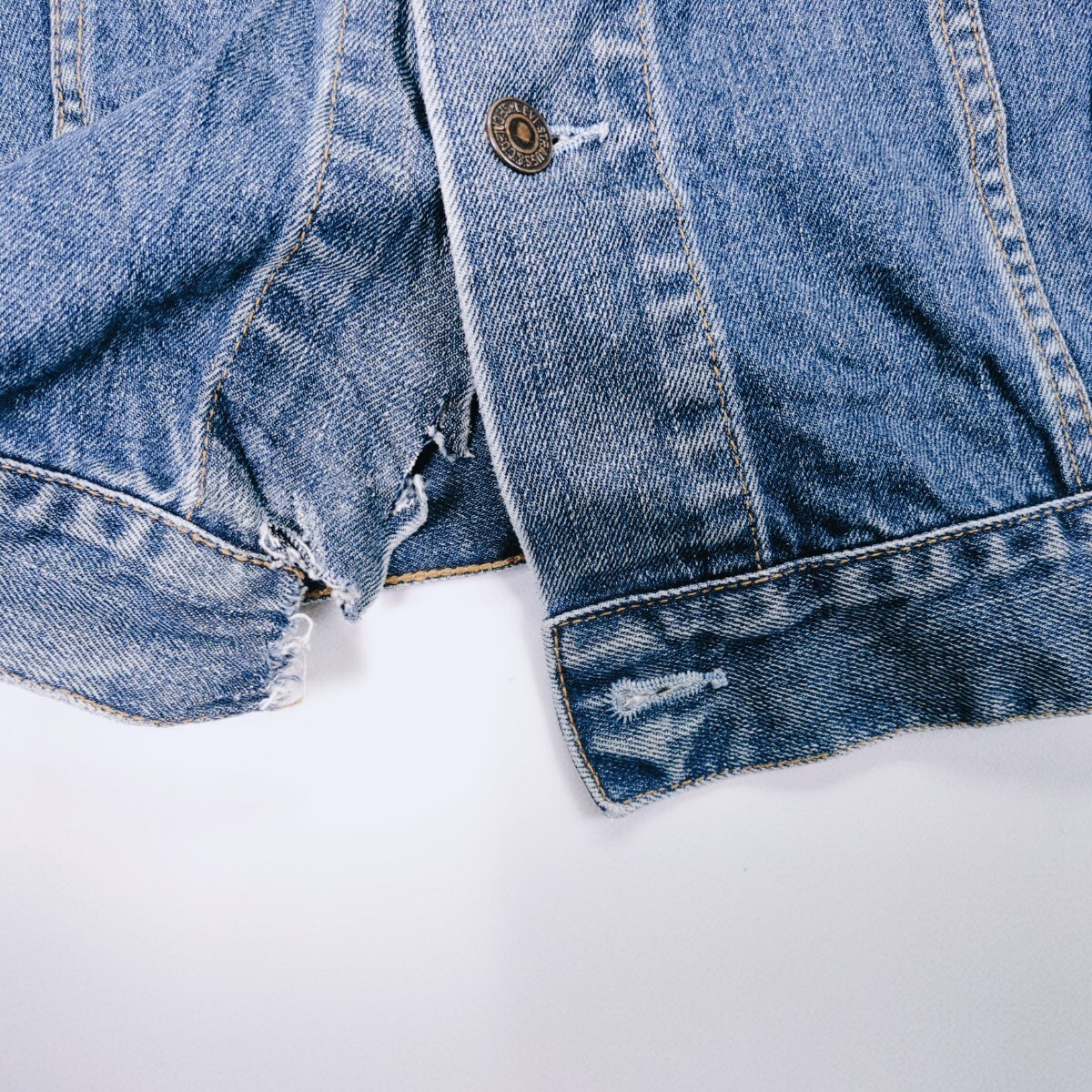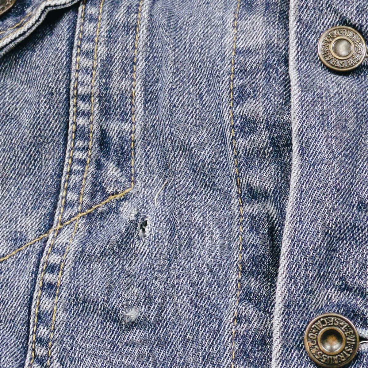 右胸に小穴、左袖口破れあり、左肩付近薄くシミ、一番下のボタンと布部分破れ欠品
