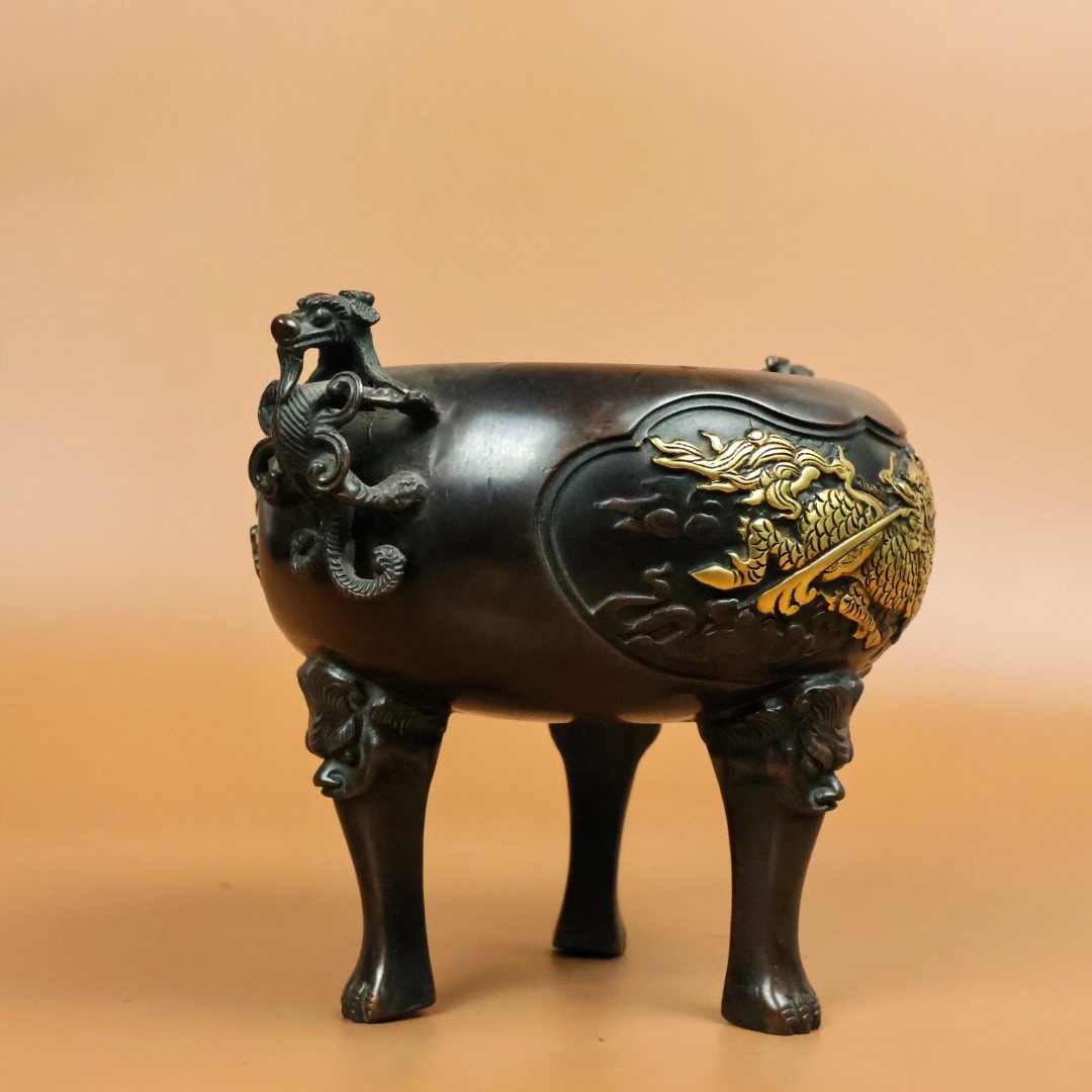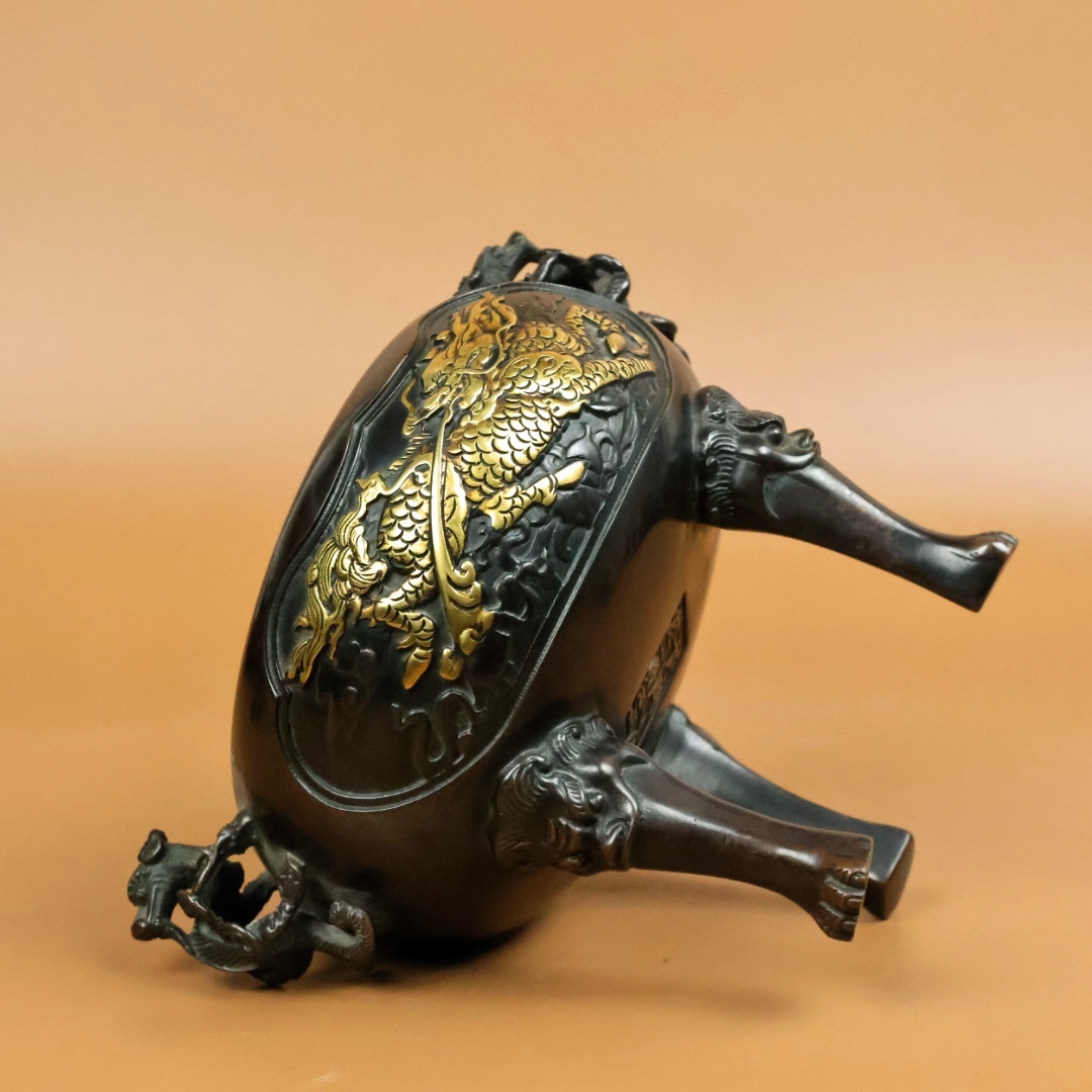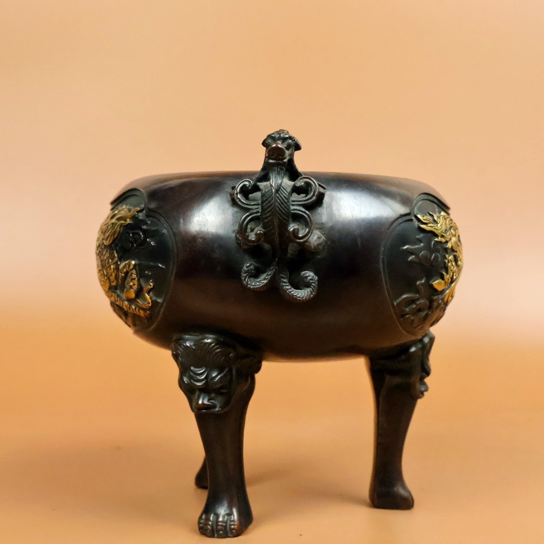 『明代・大明宣德年製款・宮廷御製・紫銅流金彫・獣耳香炉・神獣三足炉・香道』極細工・時代物・東洋彫刻・古賞物・中国古玩・中国古美術