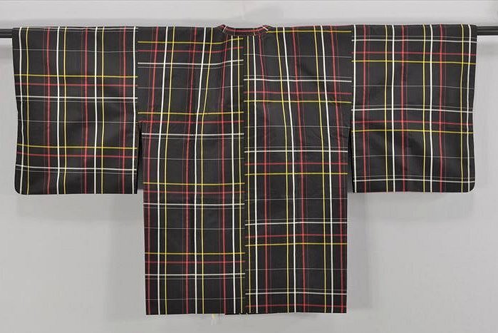 ▲まいど家 P1-02-32 道行コート 黒地 格子模様 76㎝ 昭和