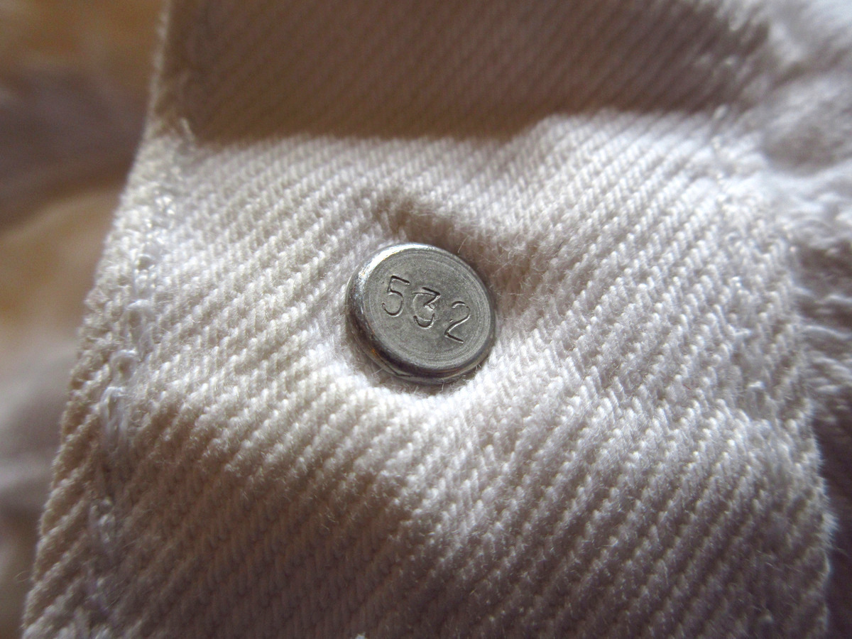 ボタンフライ、ボタン裏の刻印「532」、赤タブスモールe、MADE IN U.S.A、裾チェーンステッチ