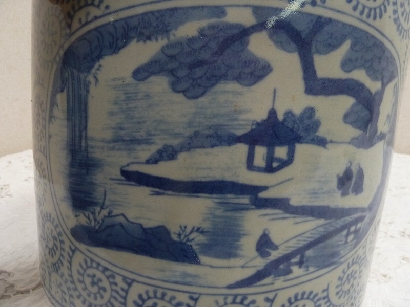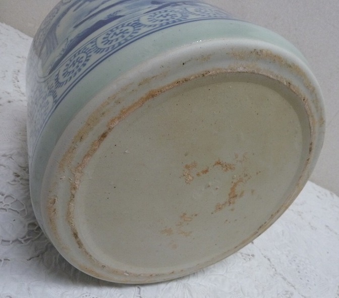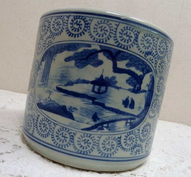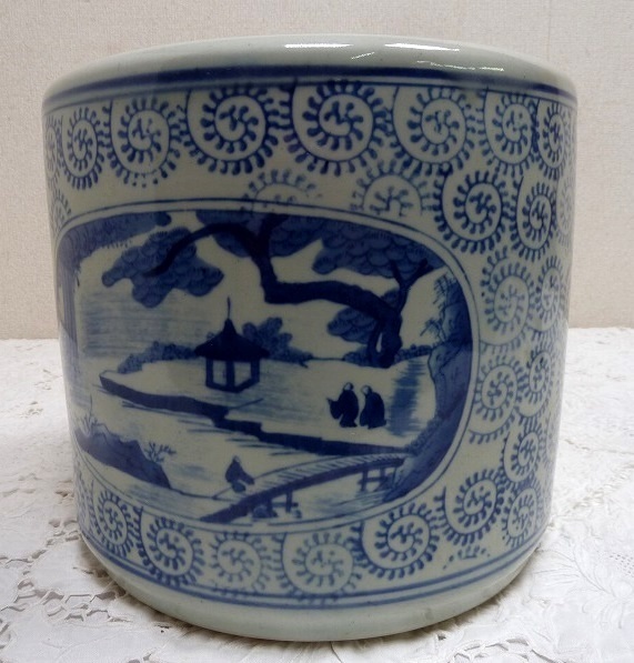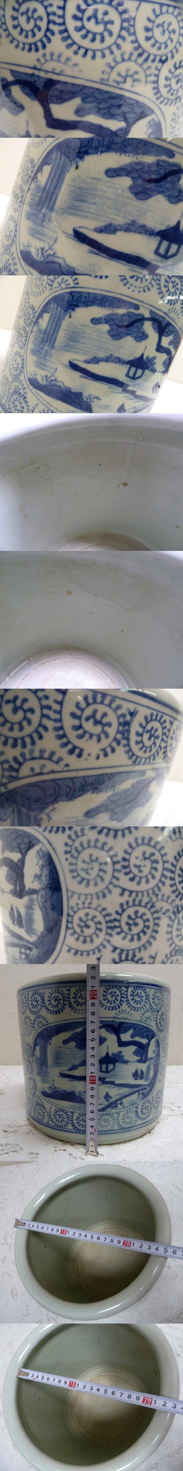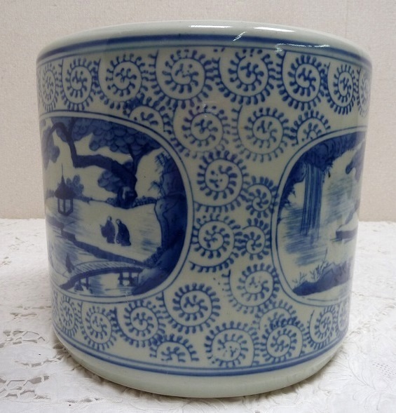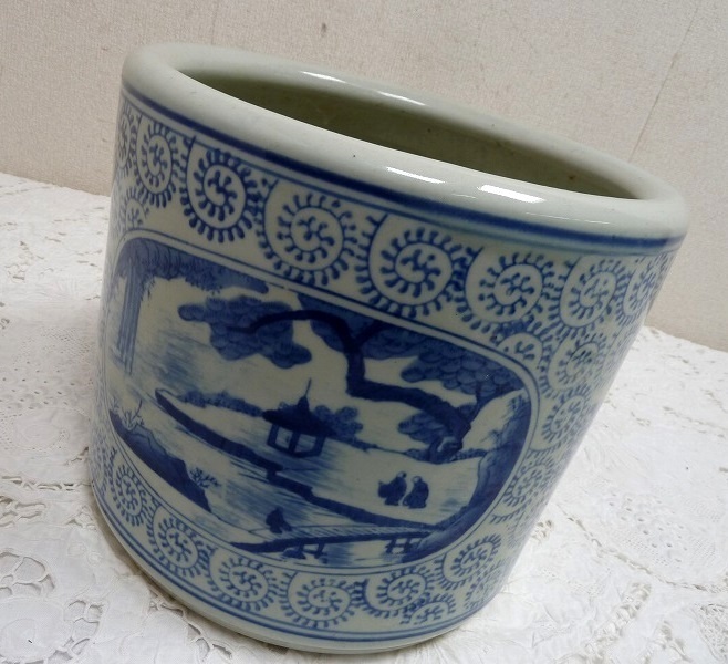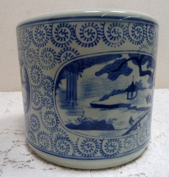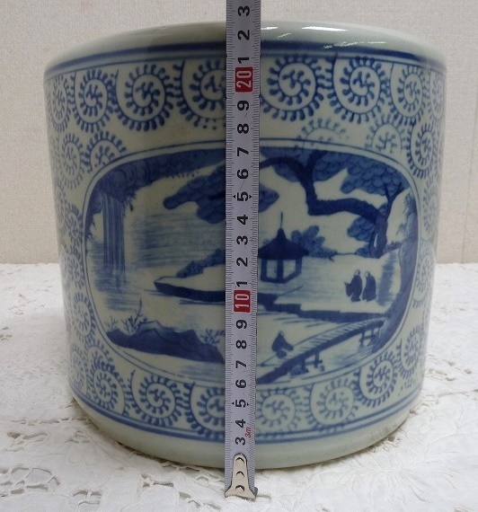 (☆BM)旧家蔵出し品 陶器製 手あぶり火鉢 染付 山水 寺 高さ23×直径26㎝ めだか鉢 金魚鉢 鉢入れ レトロ