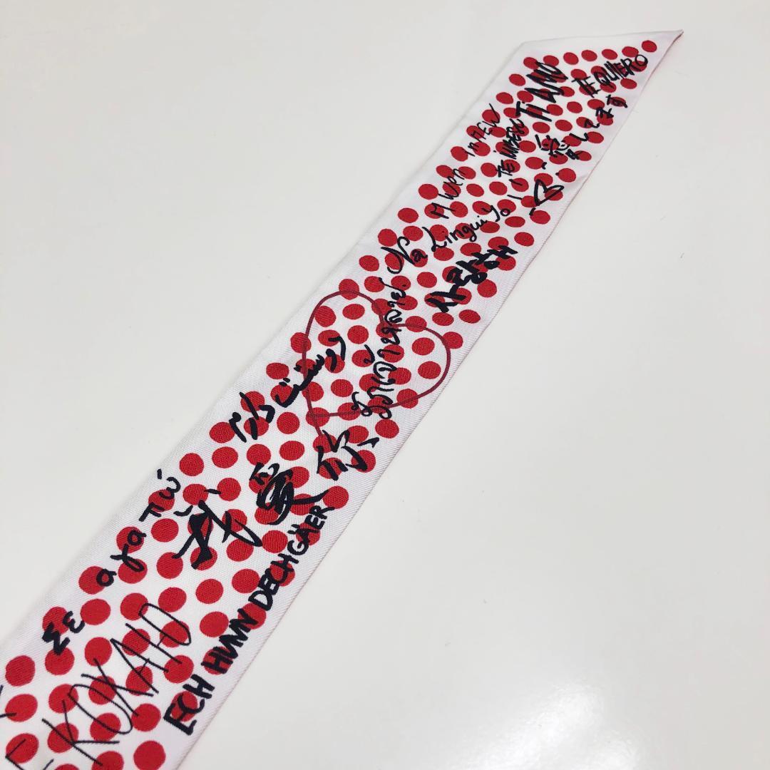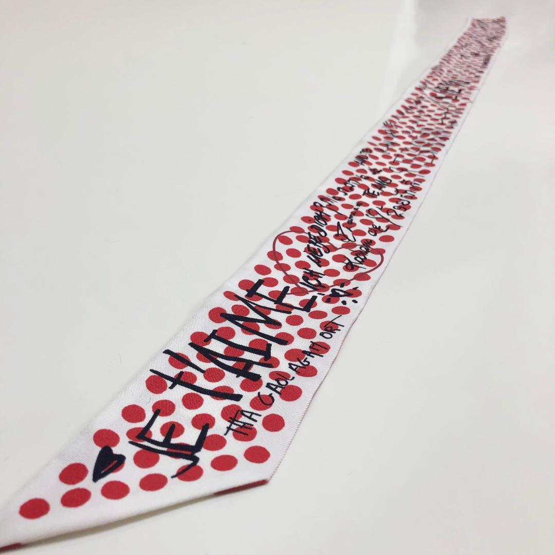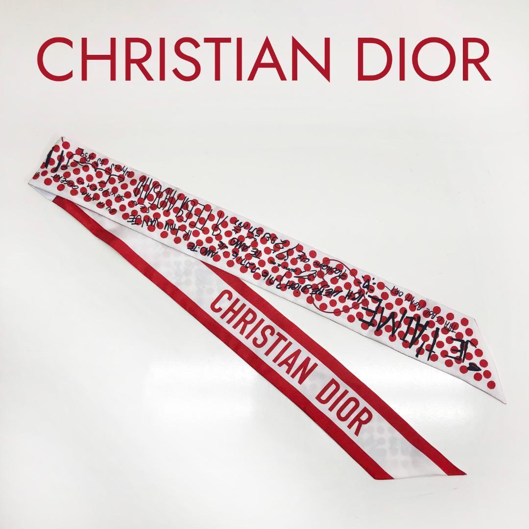 Christian Dior クリスチャン ディオール ミッツァ ドット スカーフ リボンスカーフ バンダナ レッド 赤 水玉 ドット柄 ポルカドット ハンドドロー 手書き文字 ラフ ロゴ シルク レディース iloveyou 愛 jetaime tiamo