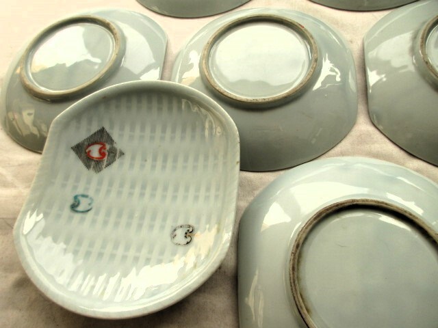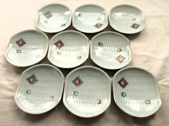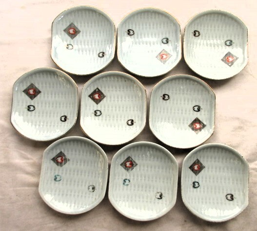 コメント:伊万里焼・印判手 5,4寸の錦絵 刺身皿、 9客揃です。