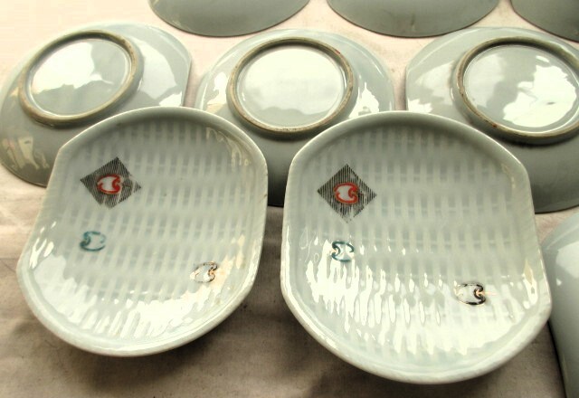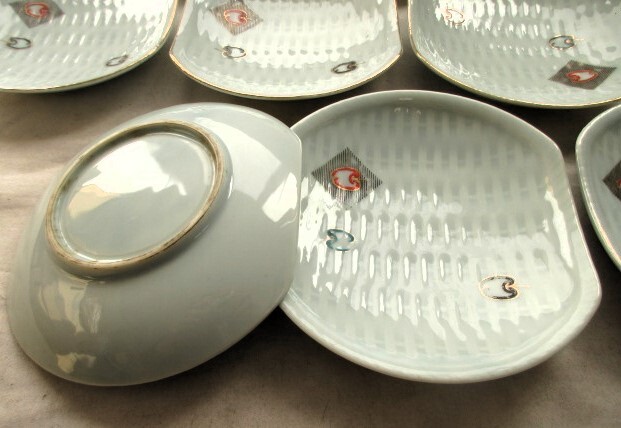 伊万里焼 印判手・錦絵 「5,4寸 小判型 刺身皿・9客揃」りんご地紋 会席料理道具 日本製