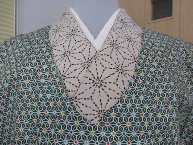 【着物用割烹着】 濃い目の緑色地に麻の葉柄 浅めのV襟 Lサイズ 着丈110CM