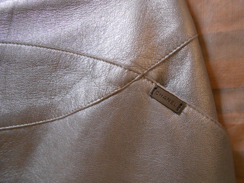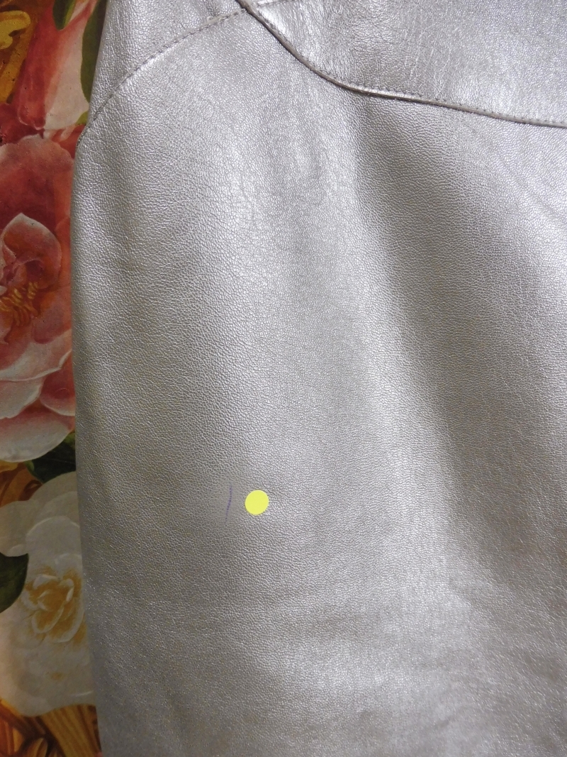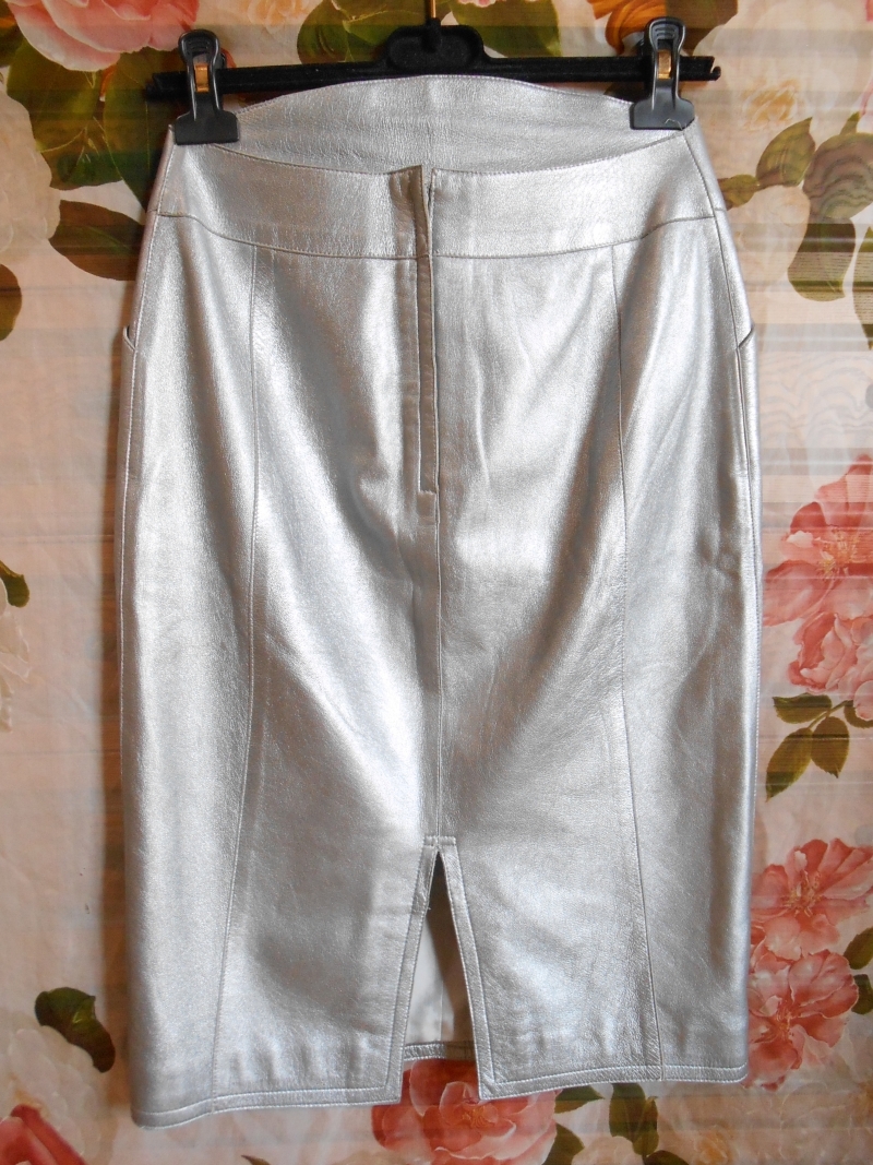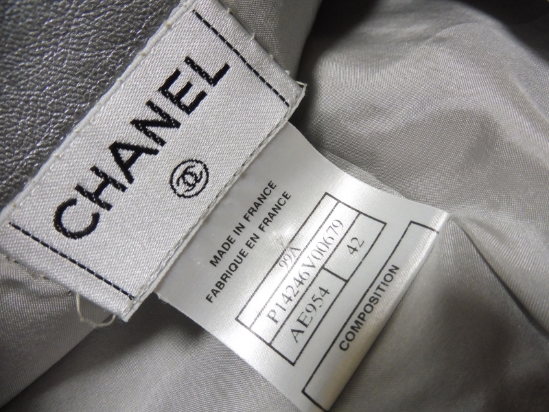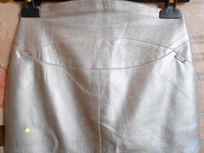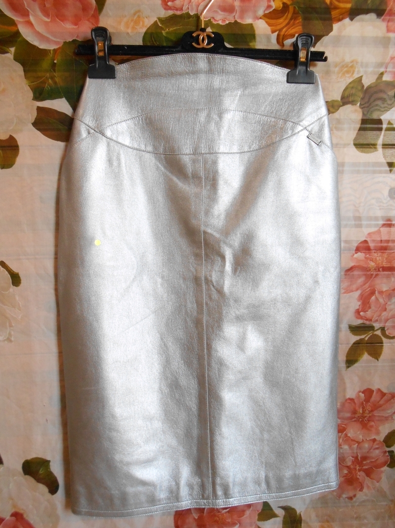 シャネルの1999Aコレクションのアーカイブ革製スカートです。素材表記はラムスキン00%。裏地はシルク100%。サイズ表記42。ポケット上W37㌢、H46㌢、丈は背面が約61㌢、前は最高部から66㌢。背中央の三角スリットが約8㌢。ソフトなラム革を銀色染色。特別デザインで前ウエストを上弓型にして、それと並行してステッチ。その両サイドにポケット。センターにステッチ。背面は中央に着脱用ジップ。裾に三角形スリット。左ポケット下に艶消しのCHANEL刻印入り金属プレートでさりげなくブランドをアピール。このクラスのスカートを出すのはエルメスだけの印象。参考価格50万円超? 訳ありの理由は右サイドに付いたペンの線。フランス製、カンボン本店購入品。10回未満使用品。めったに出されない希少品ですのでシャネルファンにお勧めです。