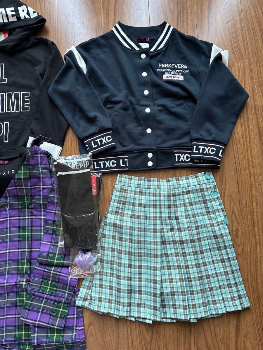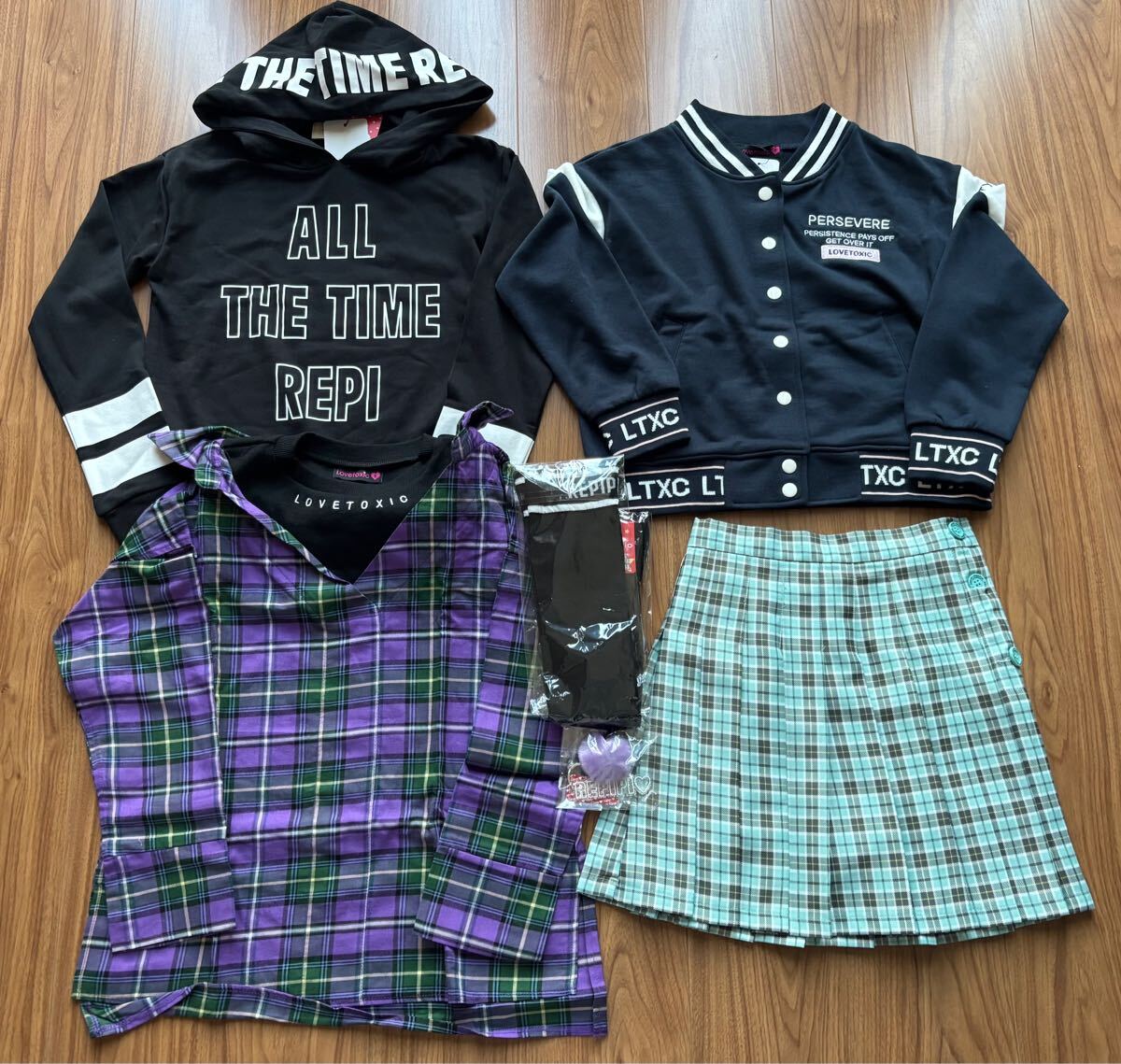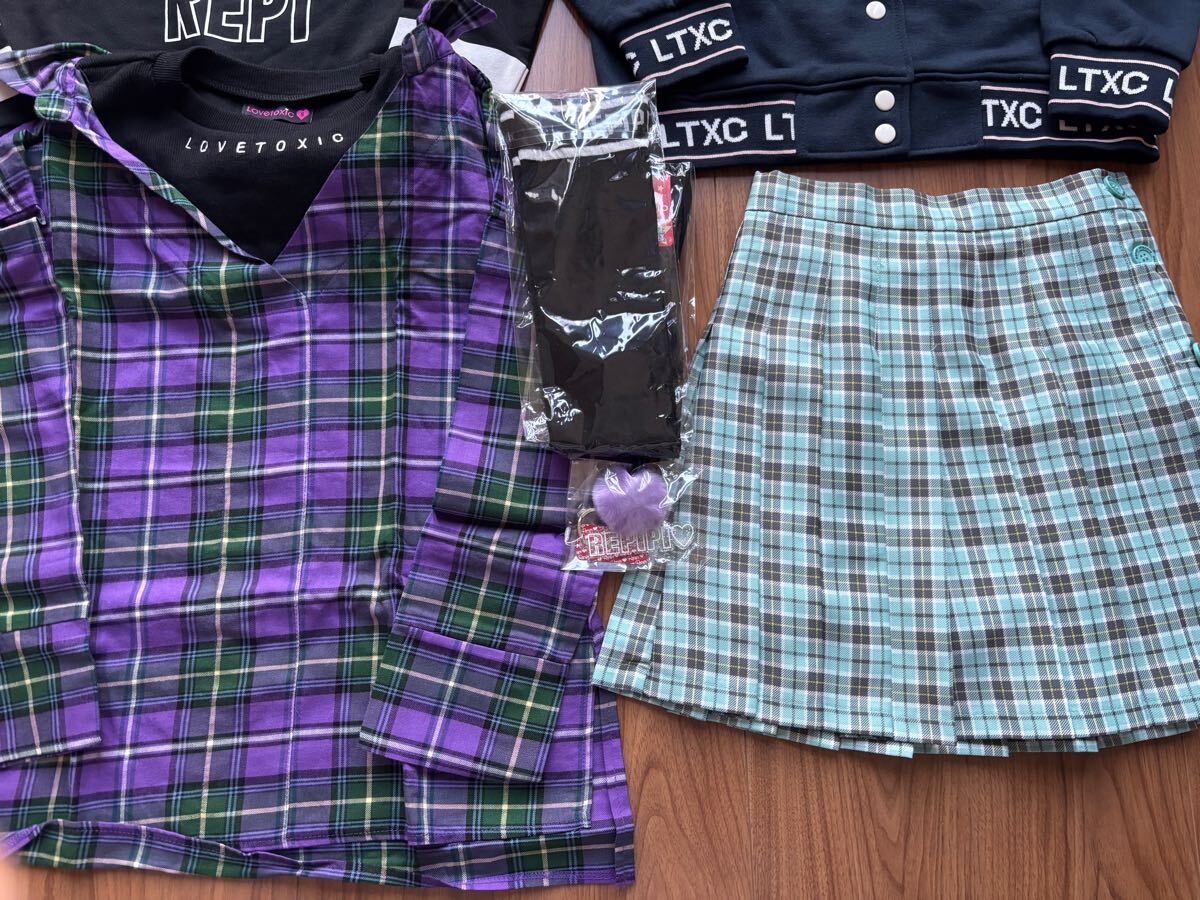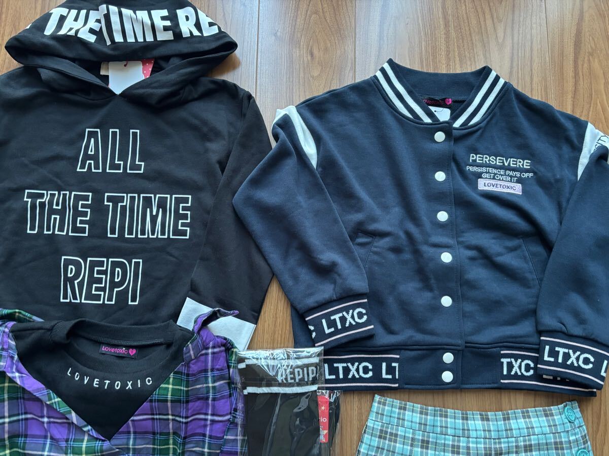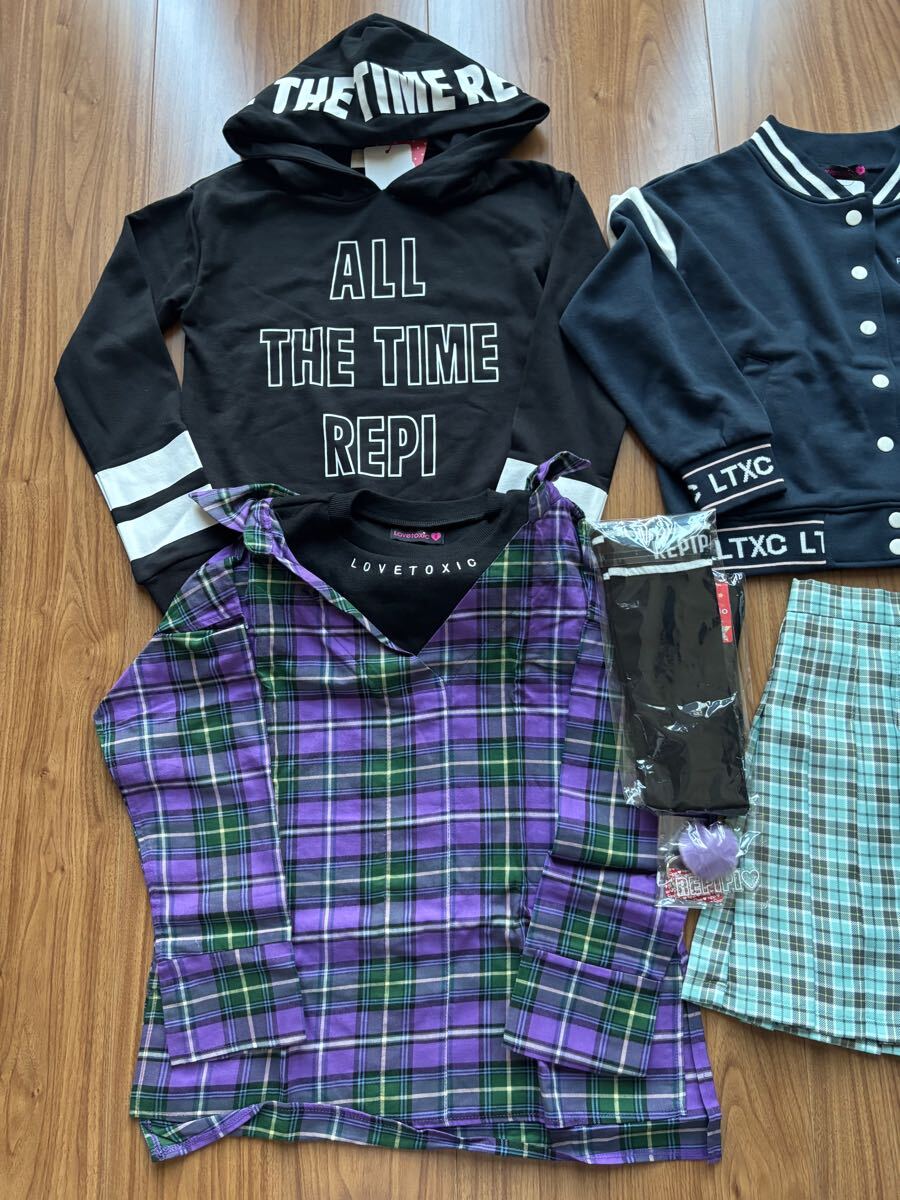 ラブトキ アウターSサイズ3,900円、レピピ 黒パーカーXSサイズ3,900円、レピピ チェックプリーツスカート XSサイズ3,900円、ラブトキ チェックシャツSサイズ2,900円、レピピニーハイソックス900円、レピピ キーホルダー800円の6点セット定価合計17,930円税込です。