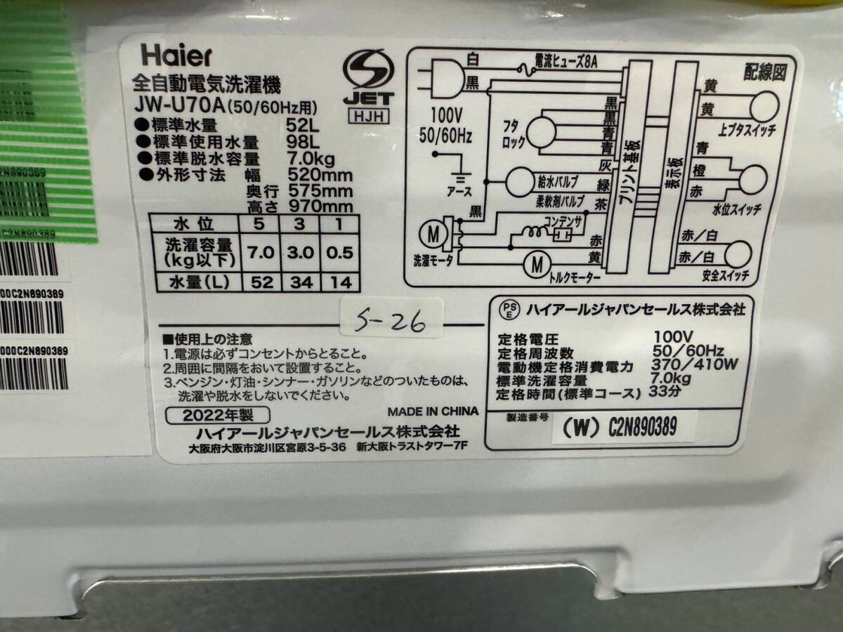 大阪送料無料★3か月保障付き★洗濯機★ハイアール★7kg★2022年★JW-U70A★S-26
