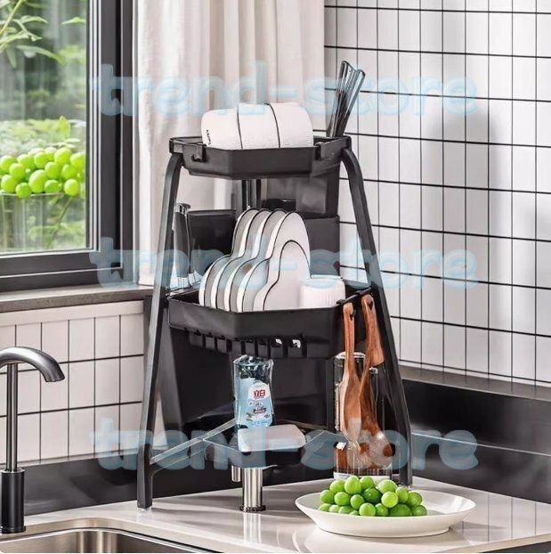 充実の付属品 /材料:(ダブルレイヤー/基本バージョンアクセサリ:シンク/棚*1、ボウルラック*2、洗剤ラック*1、箸立て*1、フック*4)これらの構成要素の全ては調整や、取り外し易ク、お手入れも便利。耐蝕性抜群!表面には焼付け塗装をされて錆びにくくて防水性が優れて長時間にお使えます。