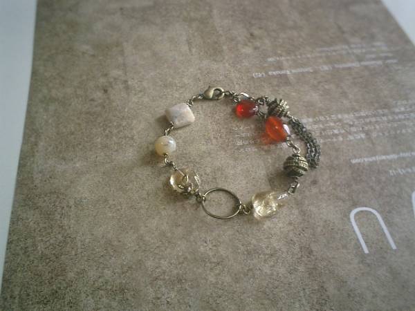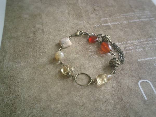 ネオ・ロマンチック・・シリーズです♪オリエンタルロマン・・やさしい色でまとめたシックなブレスレットです♪座金でおめかしした10ミリから12ミリ位までのシトリンや8ミリの丸玉、スクエアのアフリカンオパールや9ミリのコイン、13ミリのナツメのカーネリアにデザインメタルを合わせて大人のロマンチックしています♪♪長さは全長23センチ位で調節自由です♪♪お揃いのネックレスも出品しています♪♪シンプルで飽きのこないいつまでも着けられるデザインを考えて作りました♪ハンドメイドをご理解頂いてノークレーム、ノーリターンでお願いします