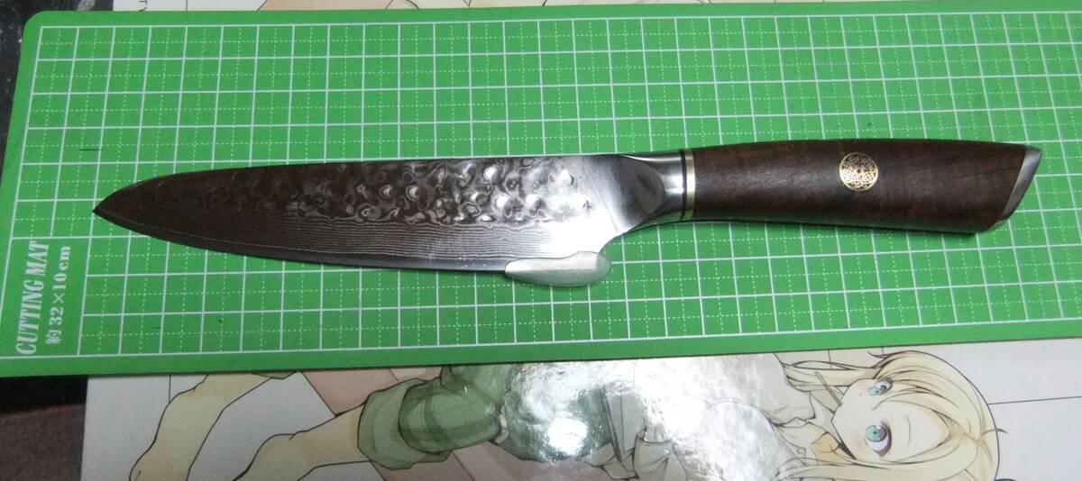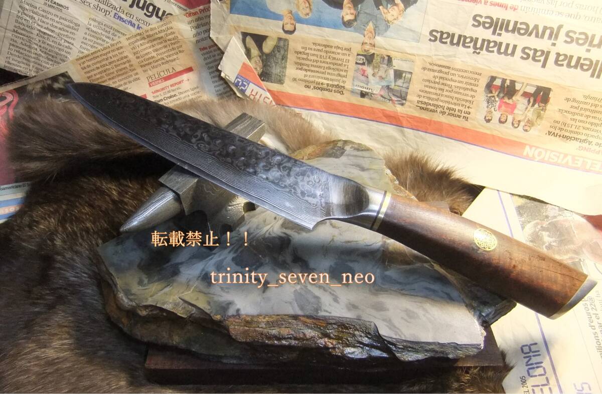 | V金10号槌目鍛造ダマスカス刃渡135mm。化石木DWハンドル。モザイクピン本刃付済 新品未使用 | |||