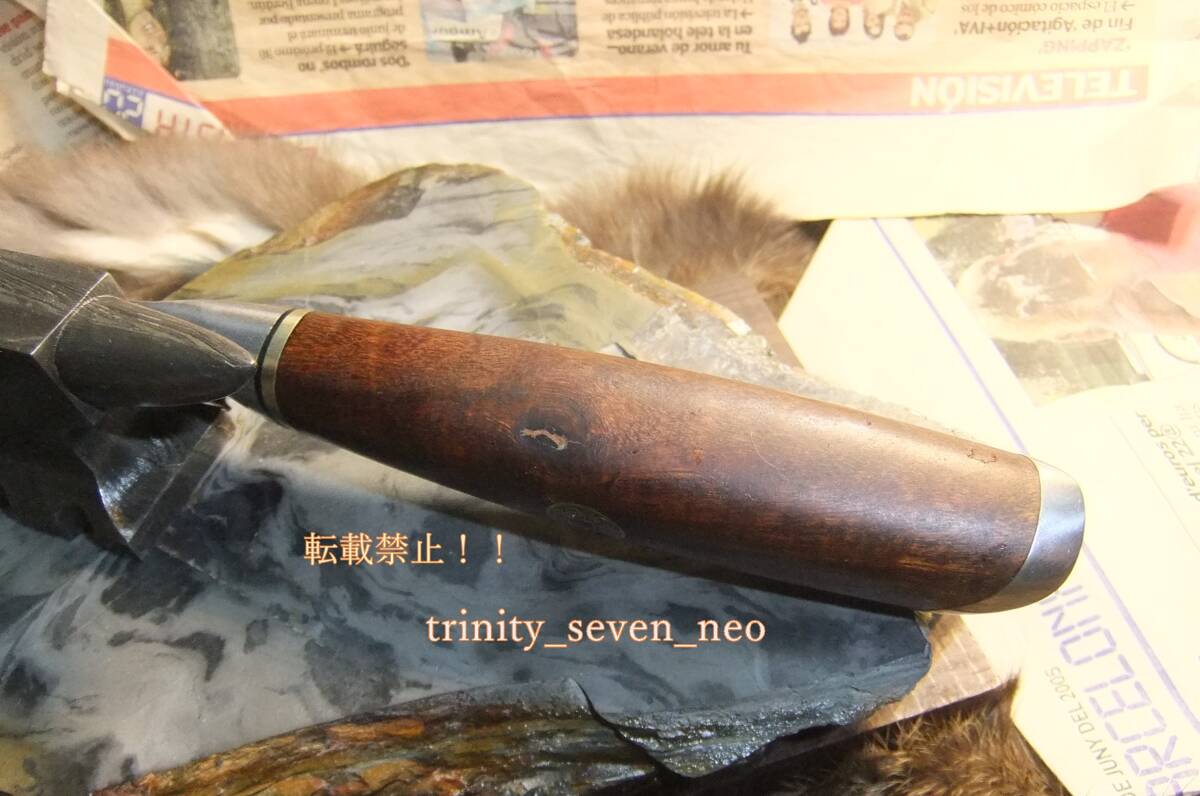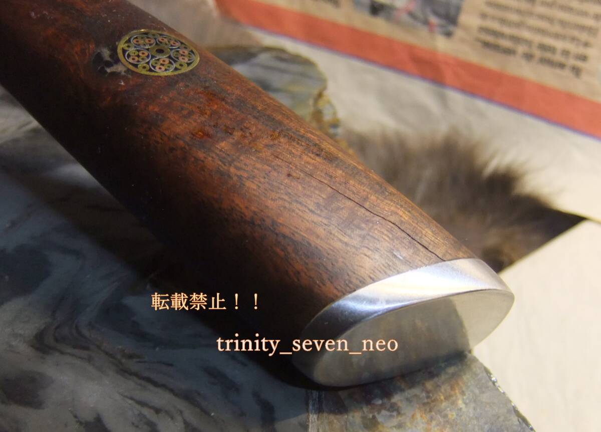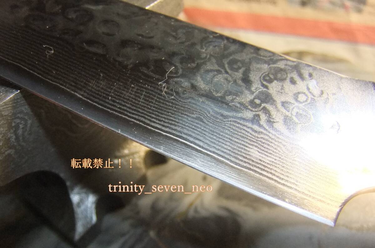 | V金10号槌目鍛造ダマスカス刃渡135mm。化石木DWハンドル。モザイクピン本刃付済 新品未使用 V金10号を槌目鍛造で仕上げたダマスカス鋼材です。刃渡りは約135mmです。ハンドルはオーストラリア産化石木デザートウッドを使用 ピンはかなり凝ったモザイクピン仕様です。。 結構前に堺か京都の職人さんが常駐生産する前にテストで作った物だったと思います。付属品は一切無いです。刃物本体のみになります。 化粧箱も有りません「元からです」。昔に都内の古い問屋さんに譲ってもらった物が出て来たので出品です。 V金10号ダマスカス鋼材を本気で鍛造した品です。通常のダマスカス鋼材よりも粘りがある良い刃物です。 間違っても「ダマスカス模様」のエッチング鋼材です。一度刃先を砥石で研いで頂ければ分かると思います。安い粗悪な刃物独特のもそもそした研ぎ汁(個人的な感覚)は一切出ないです。 刃先の微妙でしたので、天然砥石とセラミックで刃先のみを本刃付け施工をしました。 マグロの柵も崩さずに切れるように研ぎましたので荒事には向きません。 施工後は刃は刃物用の椿オイルで養生して、ハンドルは家具用のオーガニック素材のウッドオイルで磨きました。 本研刃付けとは簡単に言いますと、工場出荷の刃先のグラインダーを消して刃先を整えています 工場出荷状態で刃角はありますが、実際には購入者が使用目的で刃付けを行う前提で売られていますので、鋭角では無いです。本研ぎとは基本的には手研ぎで行っています。グラインダーでは無くUSA産のアルカンサス州のオイルストーンで中・仕上げ砥石で磨いてSPFセラミックで仕上げて最後にUSAアルカンサス州産のBHオイルストーン「日本ですと西京都産の門前青砥みたいなかなり細かく硬い石です」を使用して刃先の細かいバリ取りを行っています。鋭角な角度で研いでいますので硬い物は切らないで下さい 研ぎ後は刃物用の椿オイルで養生させて頂いています。使用する前に洗ってから使って下さい。 椿オイルは錆防止の為なので使用後は刃先をオイルでメンテして下さい。ハイカーボンステンレスでも放置すれば錆びます。鋼系は白紙・青紙等は速攻で錆びますので 梱包ですが、梱包代金等は頂いていませんので基本的に簡易梱包で発送致します。。無理な梱包を強要される方は入札を御遠慮下さい。。 あと自分はタバコを吸いませんのでタバコのヤニによる匂いや汚れはありません。 申し訳有りませんが落札後はノークレーム。ノーリターンでお願い致します。以上を御理解した上で興味がある方がいましたら御入札お願い致します。 | |||