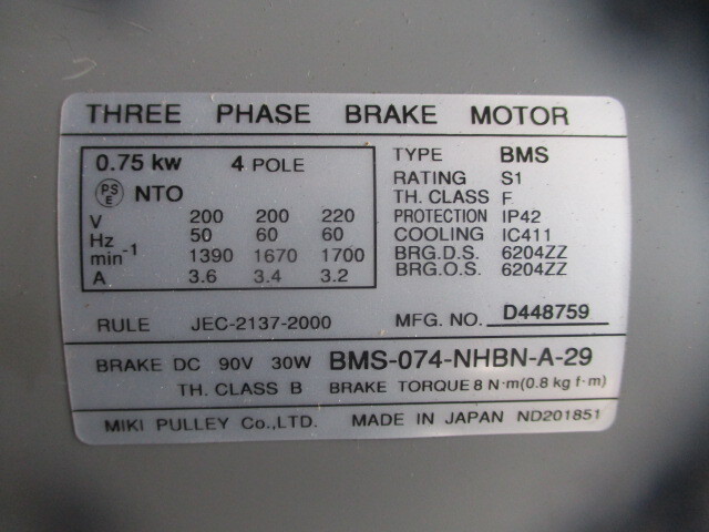 中古 MIKI モーター BMS 200v 50/60Hz 0.75kw 4Pole  になります。