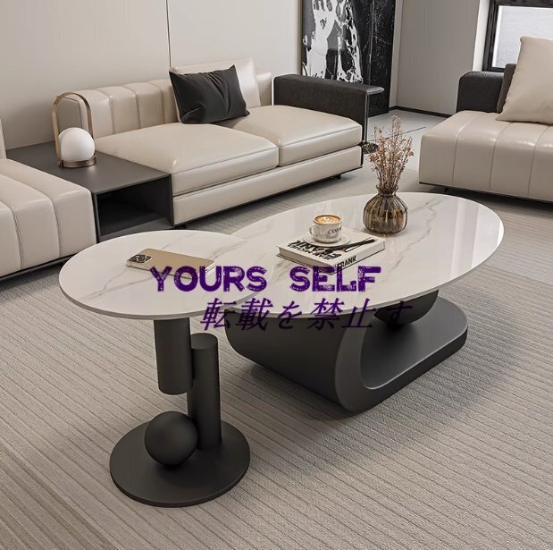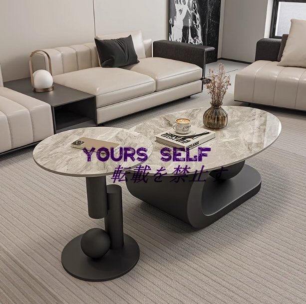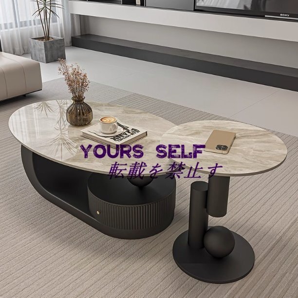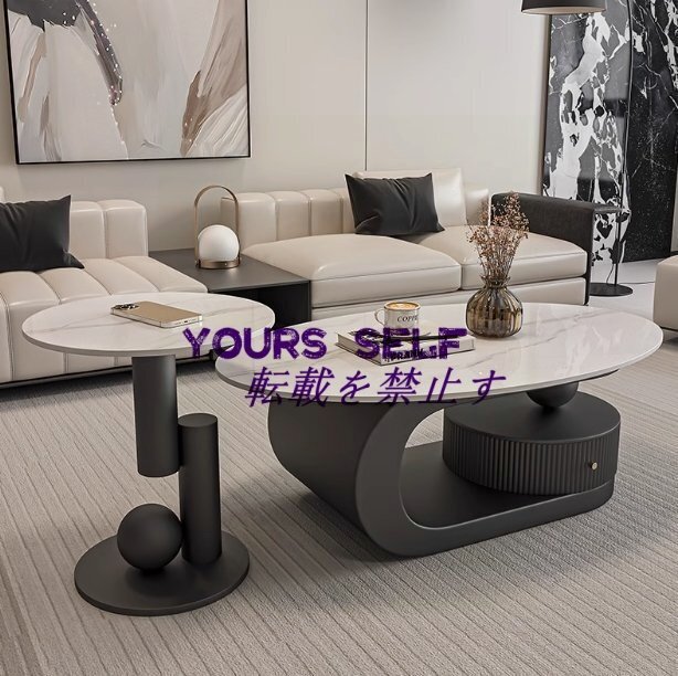 【よくできた作品】楕円形のリビングテーブルの上部は、環境に優しい素材の焼結石でできており、傷、耐水性、耐熱性を防ぎます。エレガントな鉄製ブラケット付きの高光沢のテーブルトップは、生活空間に贅沢なタッチを加えます。