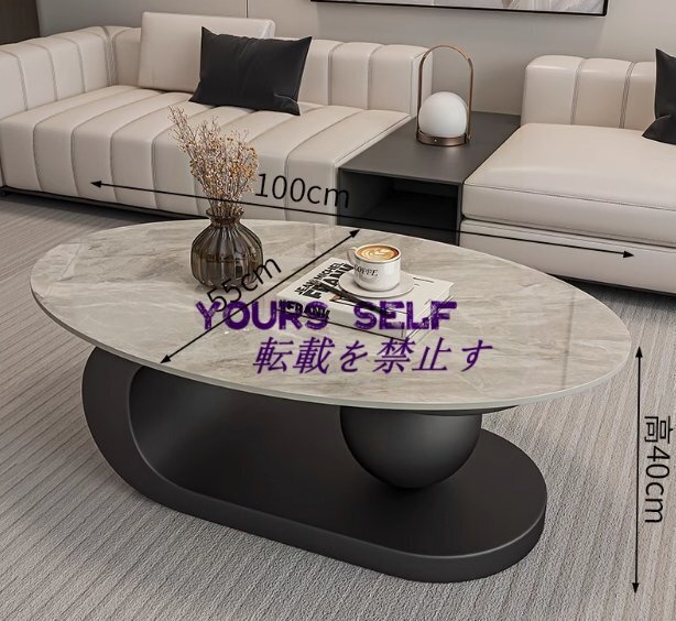 楕円形のコーヒーテーブル ローテーブル 一人暮らし モダンなリビングルームセンターテーブル 金属製の台座ベース 100x55x40cm