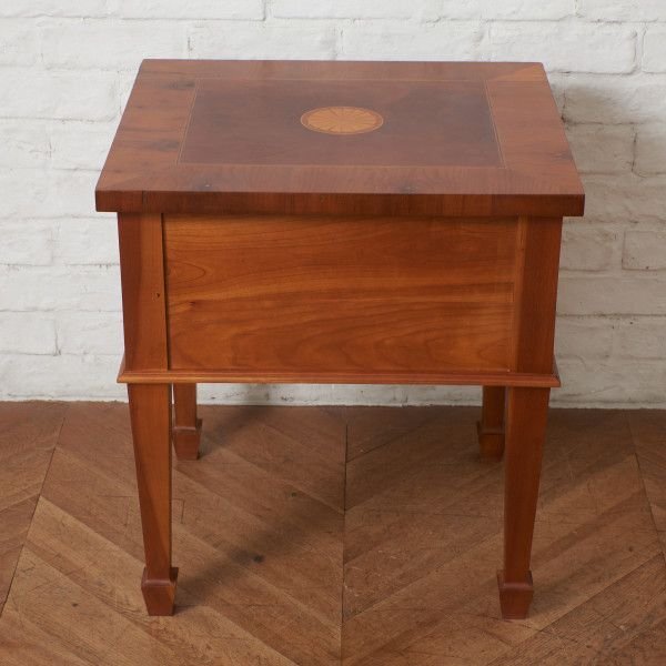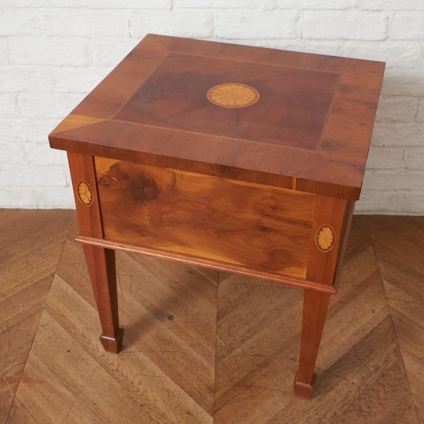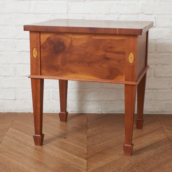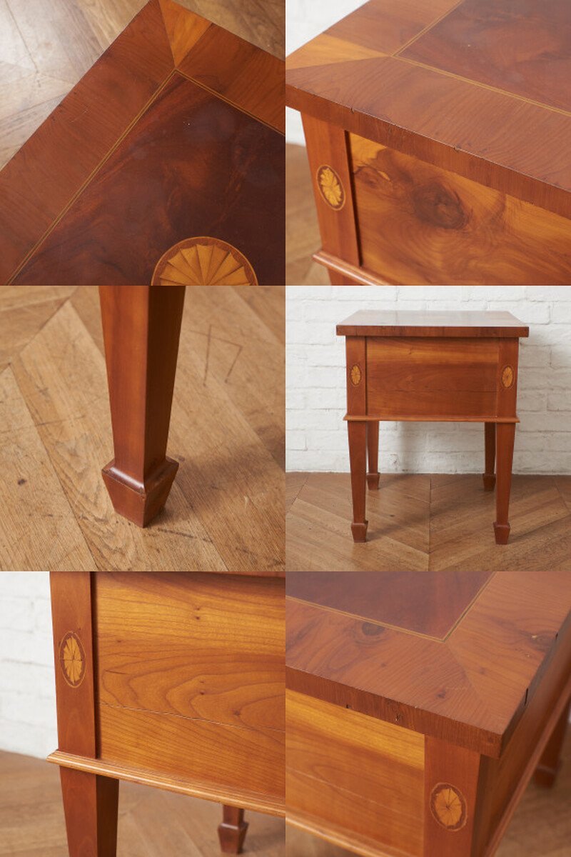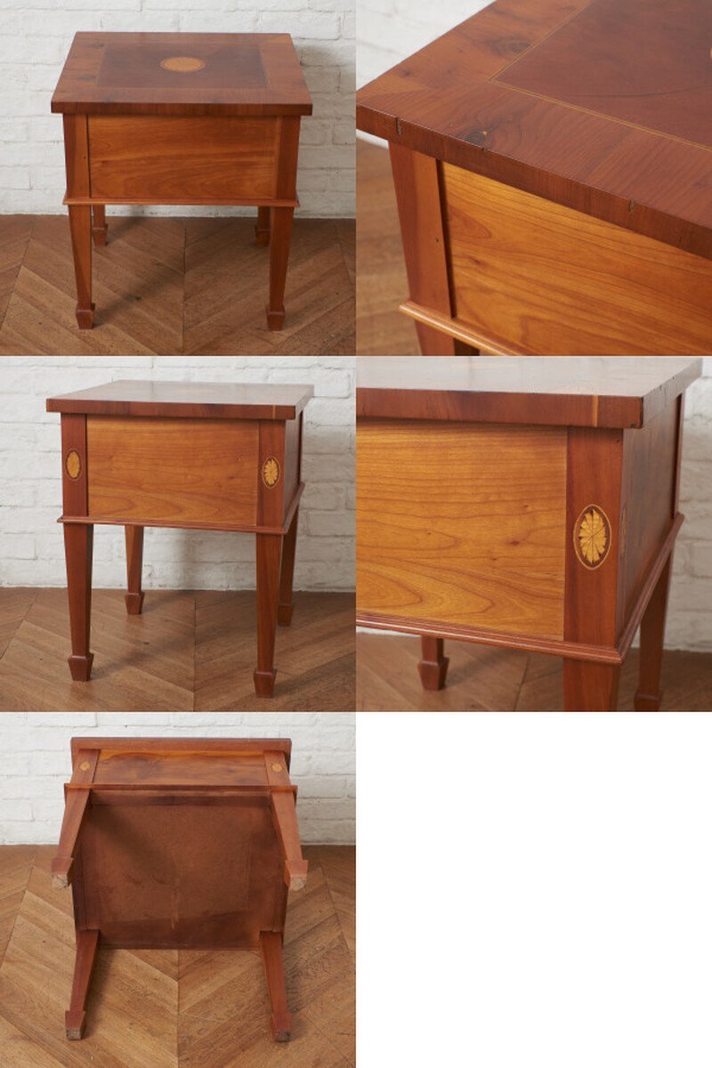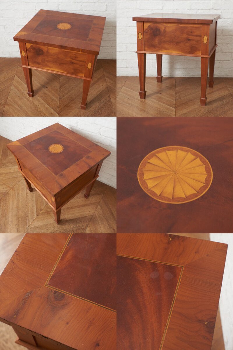 美しい木象嵌マーケタリーが施されたクラシックスタイルのナイトテーブル。過度な装飾は控えながらも、随所に見られる西欧の伝統的な様式が華やかで気品を感じるお品です。