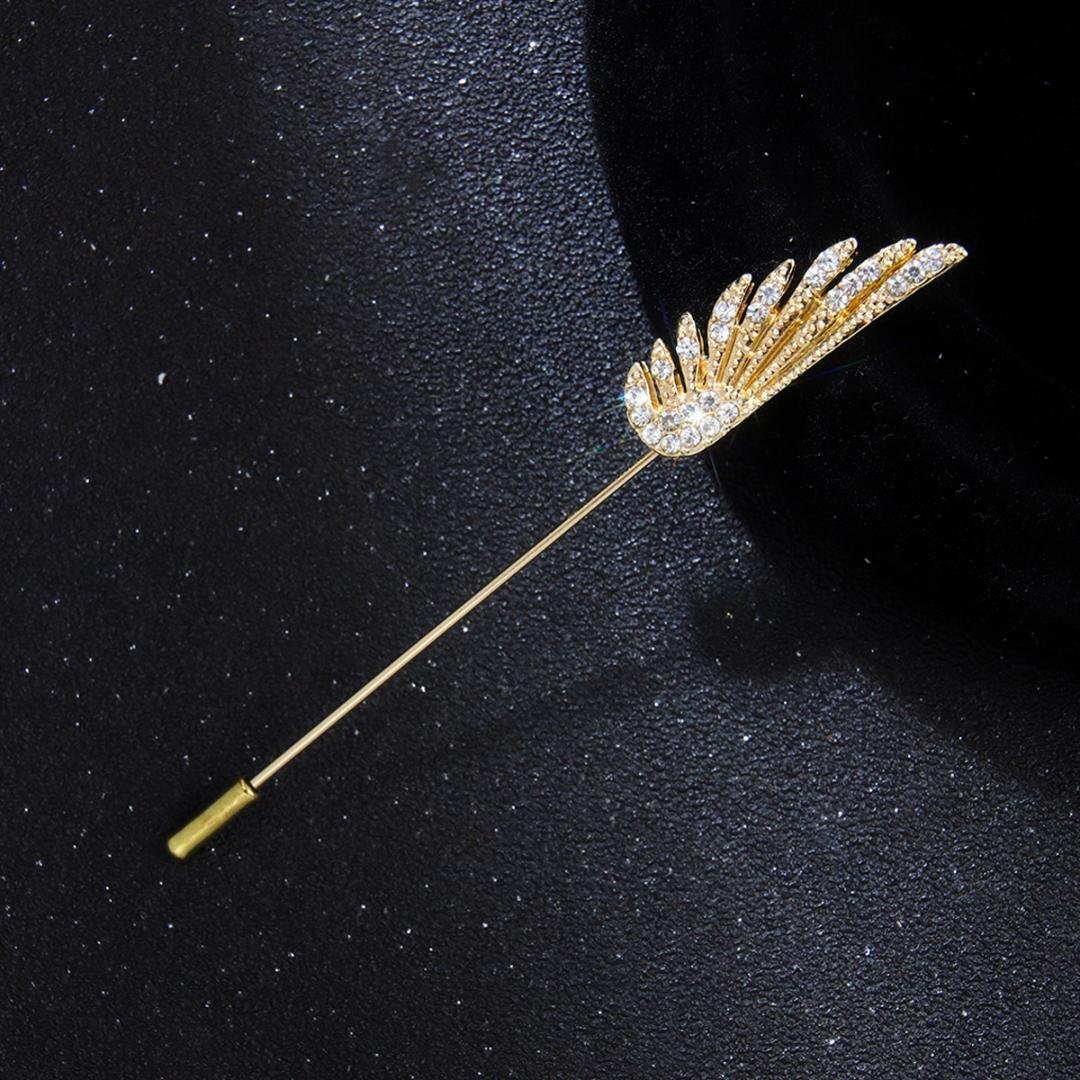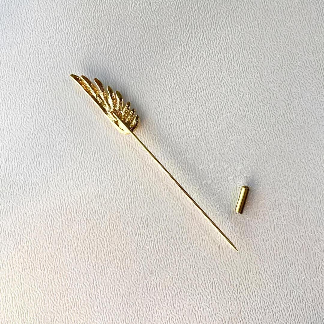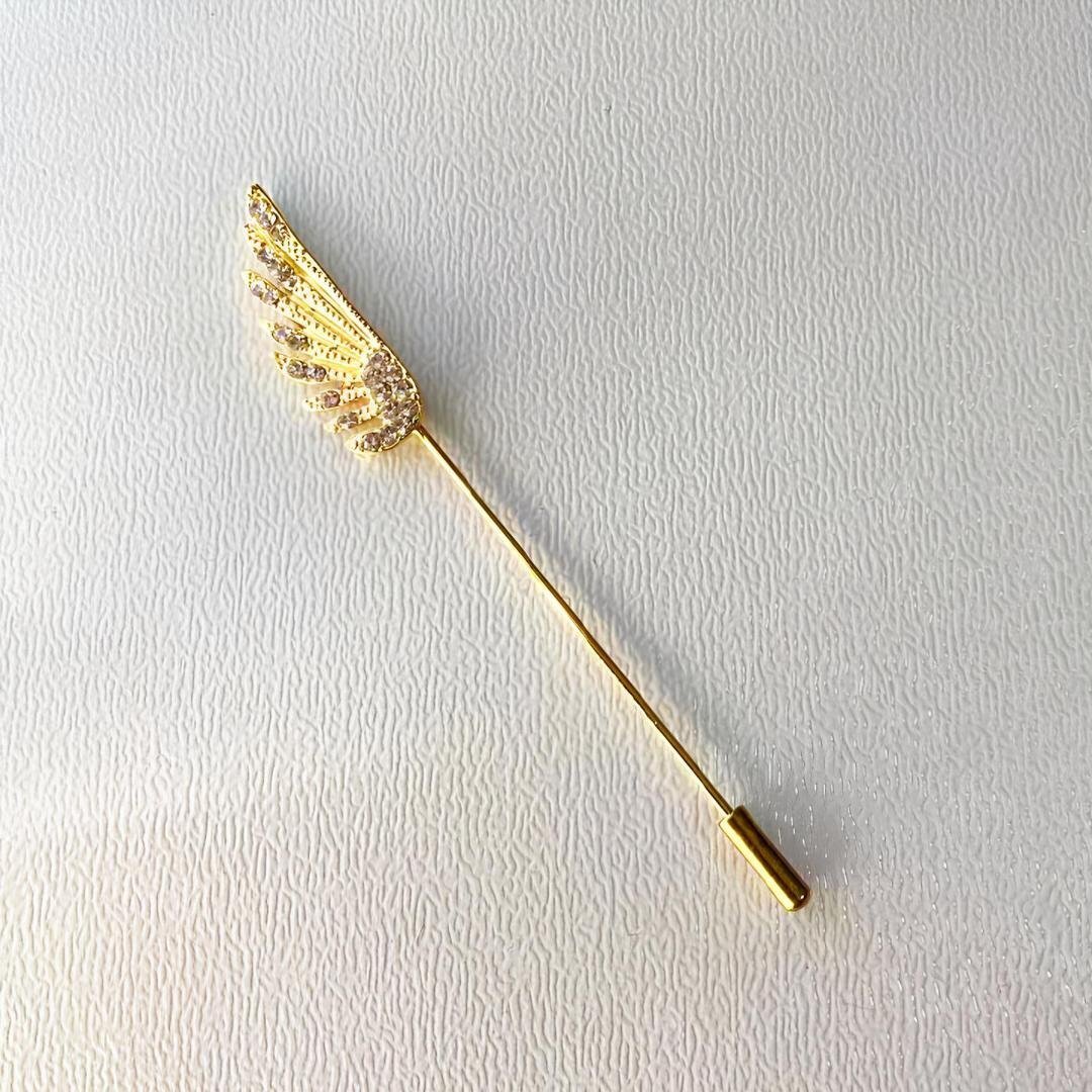 羽をモチーフにしたエレガントなデザインが特徴です。ゴールドの細身の一文字ピンに、キラキラと輝くクリスタルストーンをあしらい、上品で華やかな印象を与えます。スーツの襟元やジャケット、コート、さらには帽子などにアクセントとして使用でき、フォーマルにもカジュアルにもマッチするアクセサリーです。