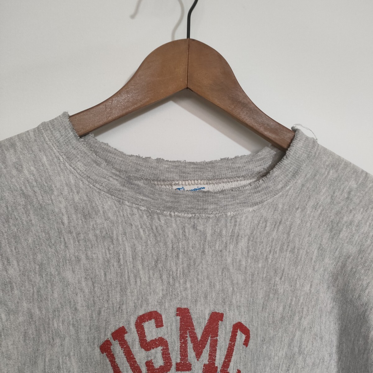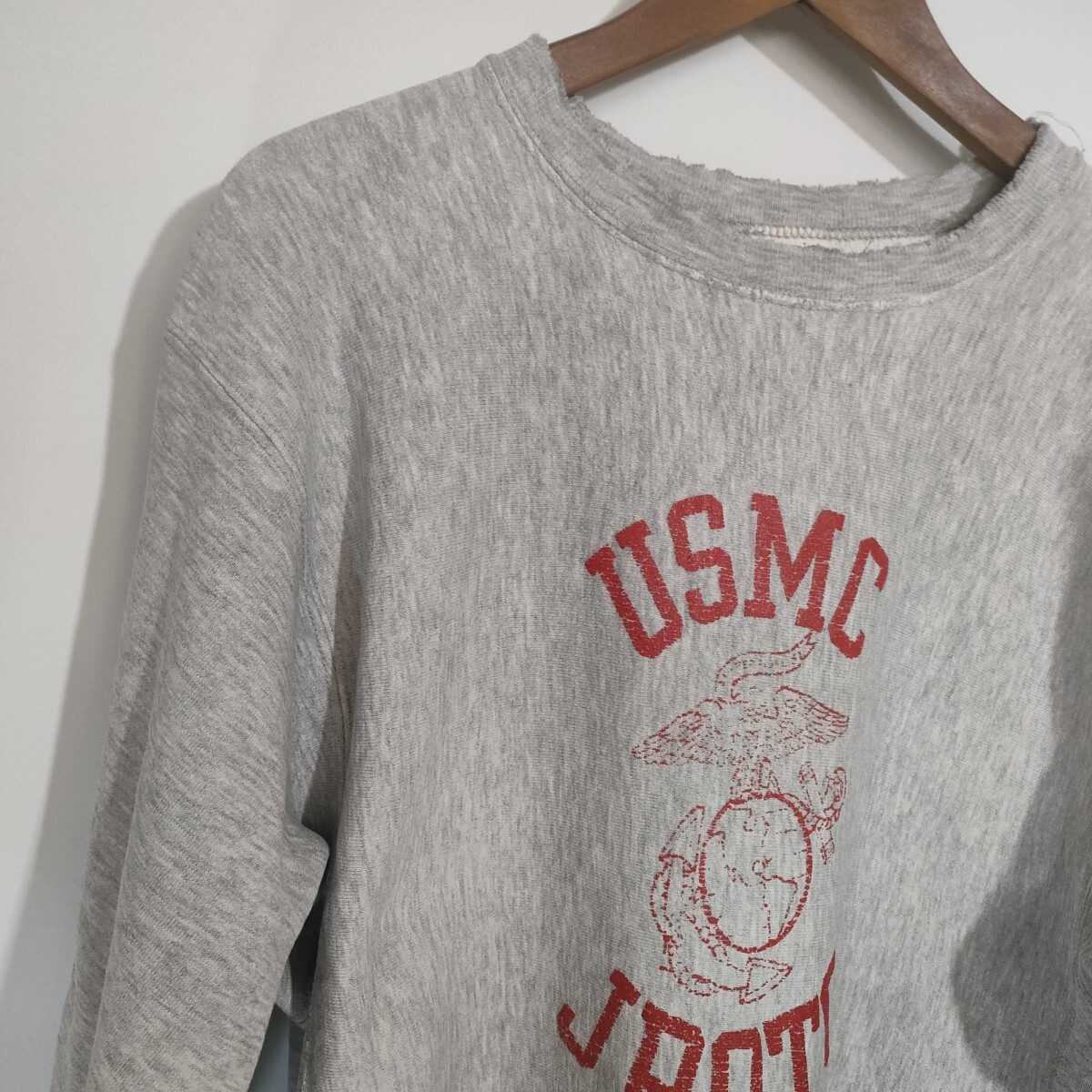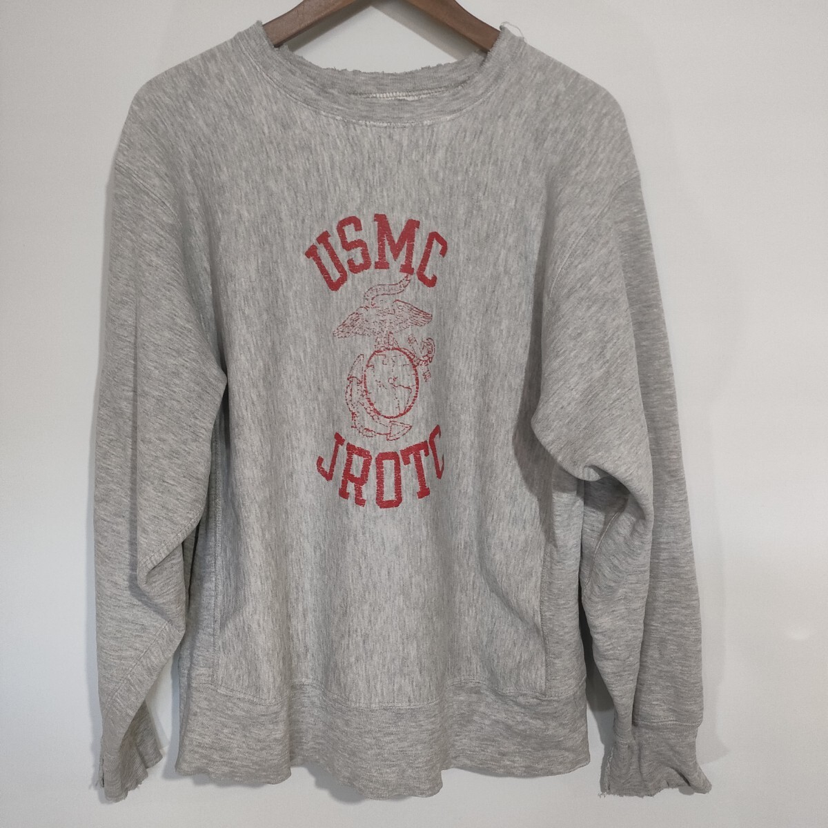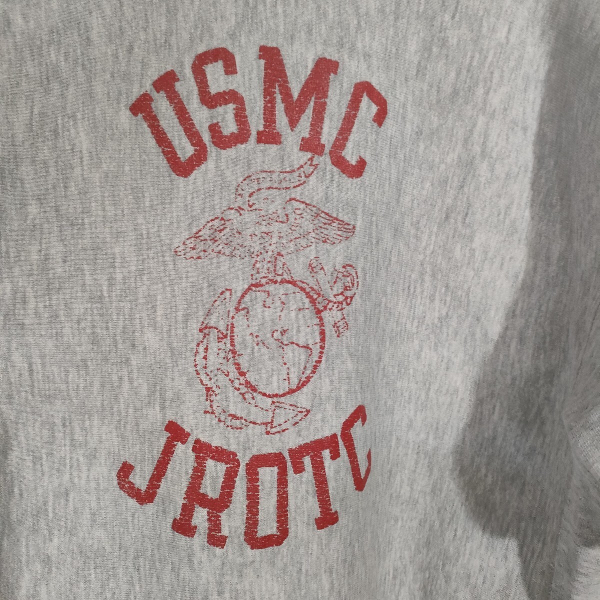 ミリタリーの中でも珍しいUSMC JROTC(United States Marine Corps Junior Reserve Officers' Training Corps)という海兵隊の予備役将校訓練課程のもので、要は有名なUSMAのUSMC版です。ボディは70s単色タグと同様の素材、シルエットが採用されている80s初期のボディのLARGEです。USMAのリバースウィーブよりも絶対に出てこないと思いますのでコレクションとしてもおすすめです。袖や襟に擦り切れはありますが、着用に問題はないかと思います。