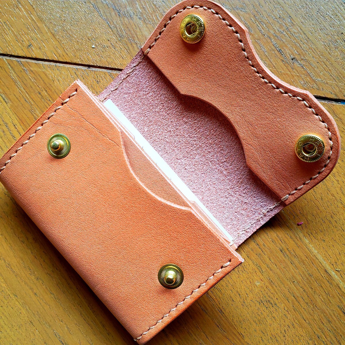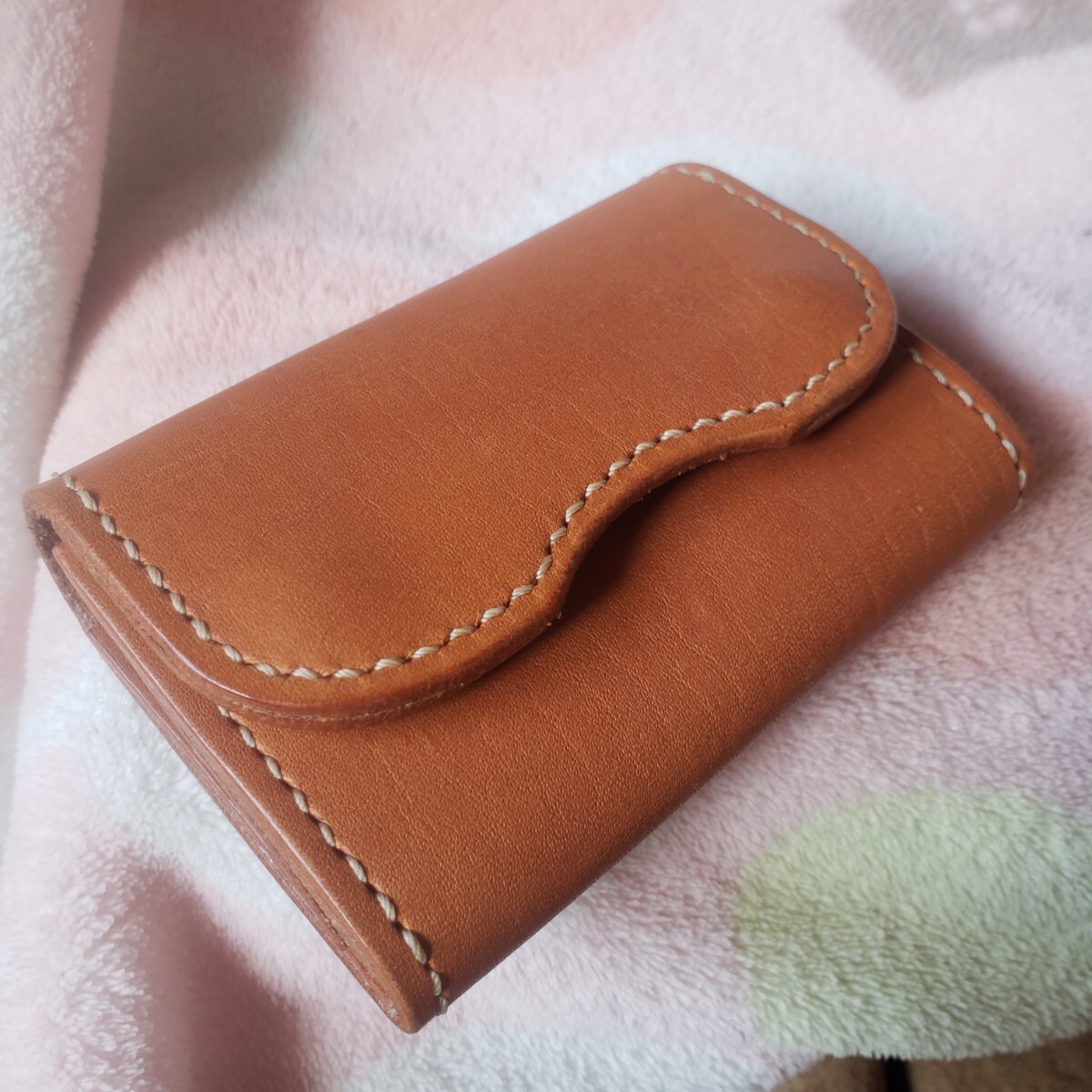 ハンドメイド、姫路レザーを使った財布コインケースで未使用ですが製作時についた小さなシワは有ります。サイズは約10cm×6.5cm×2.5cm(二つ折り時)札入れ・小銭入れ・カード入れ、それぞれ1です。晴れの日に日光浴させる予定なので今後、画像のものより飴色になると思います。