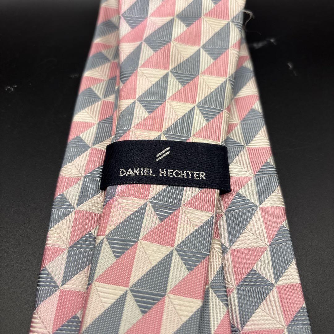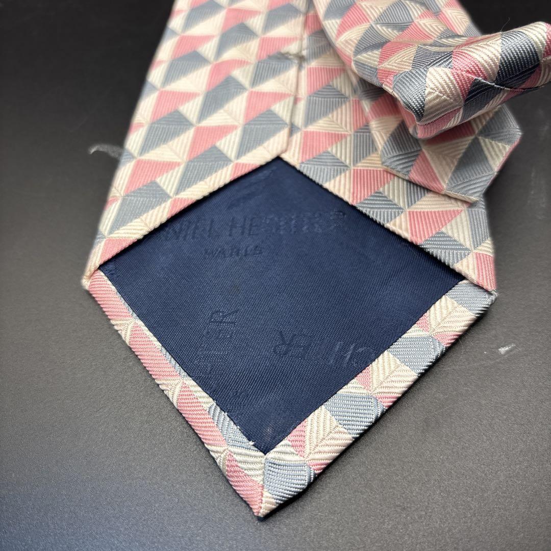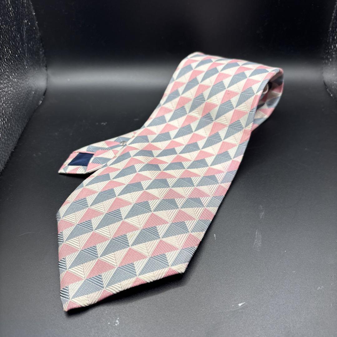 幾何学模様のピンクとグレーのネクタイ、裏地はネイビー。