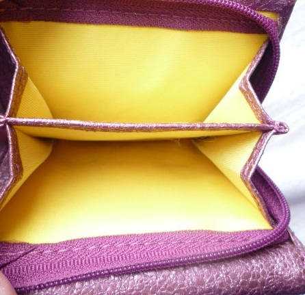 L字ファスナーの小銭入れがあり、中は黄色です。