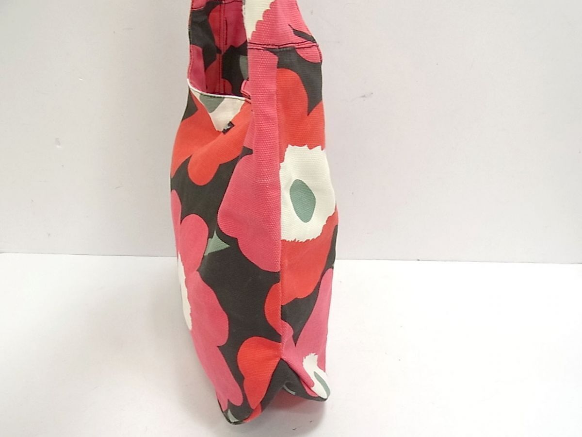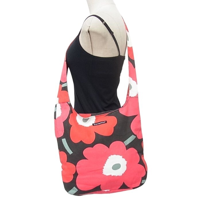 ◇ 大人気ブランド!           マリメッコ の   ブラック系の  綿 100% 素材に   marimekko ロゴ入り &   カラフルな♪ ピンク系・レッド系・モスグリーン系   大きめの  花柄 総柄 デザインが アクセントになっていて お洒落な♪  ワンショルダーバッグ・ 斜めかけ可能  に成ります。