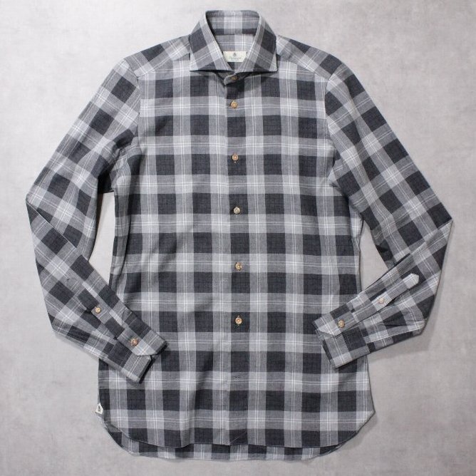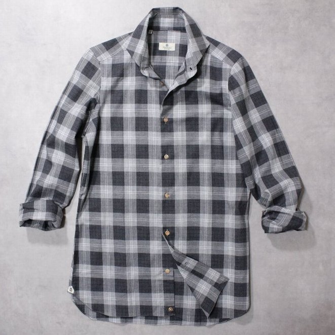 VANACORE NAPOLI ★新品3万円 ヴァナコーレ ナポリ ハーフハンドのグレーチェック柄カッタウェイ衿シャツ S(ネック39センチ)