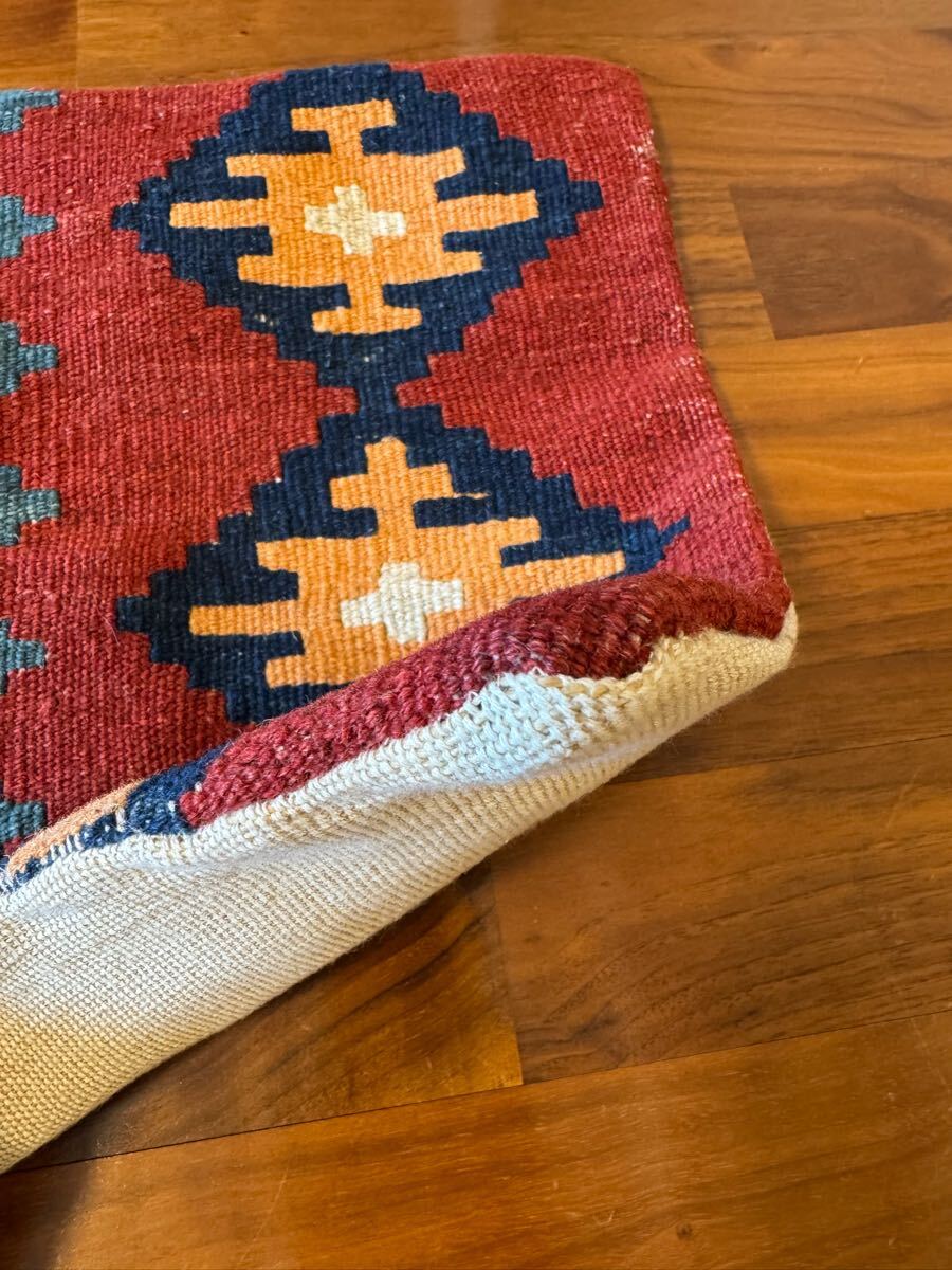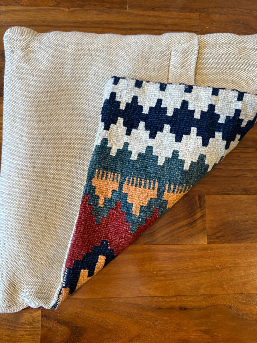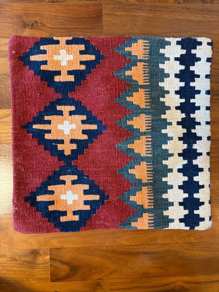 テヘラン (イラン)のキリム屋さんにてお土産用に購入し自宅保管していたクッションカバーです。自然由来の染料で染め上げた羊毛を使用し、手編みで作られています。