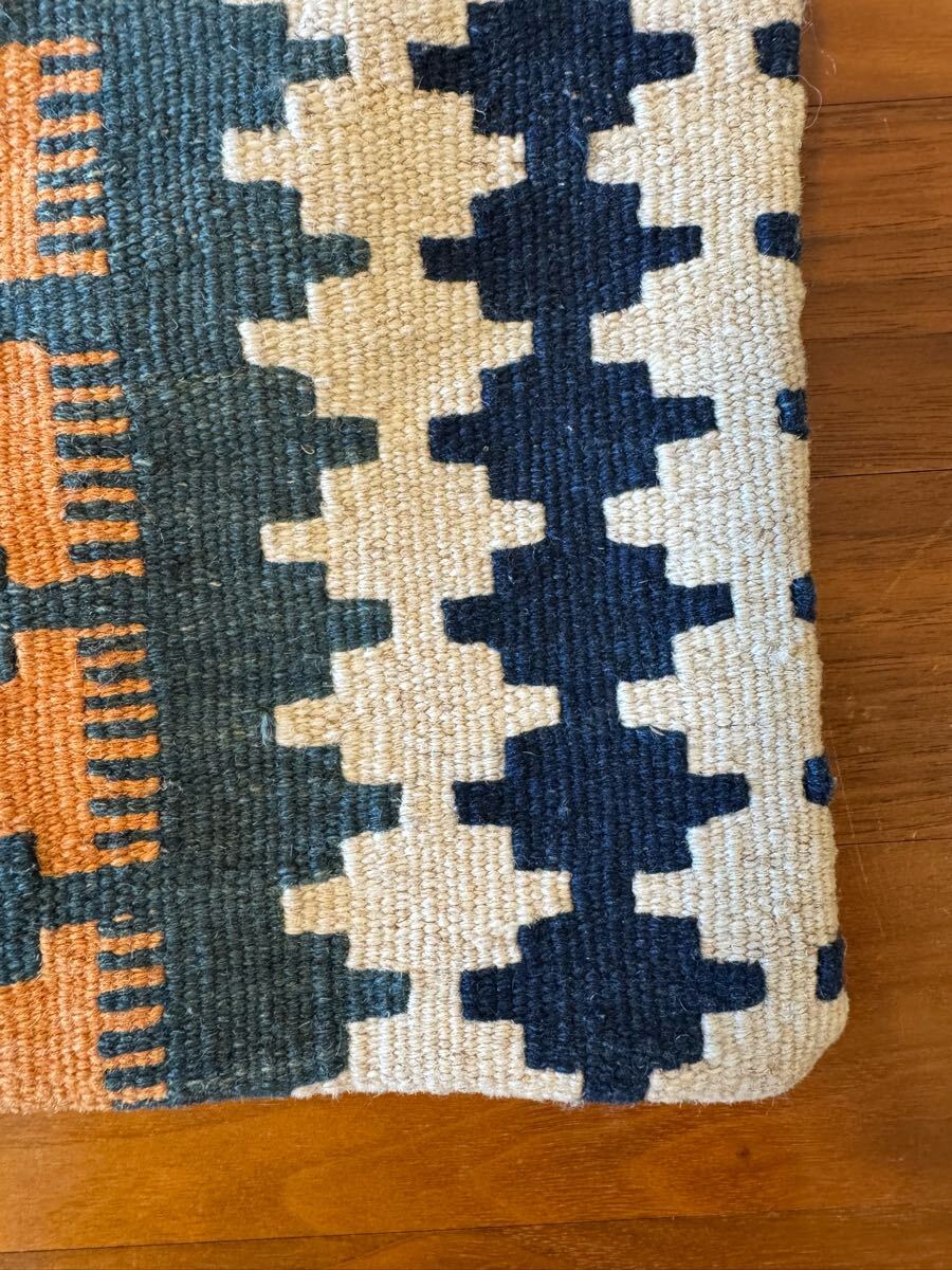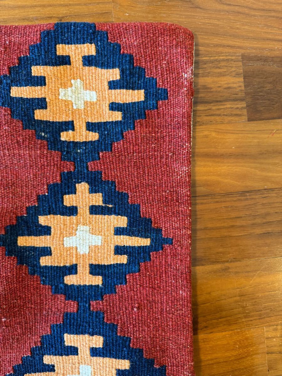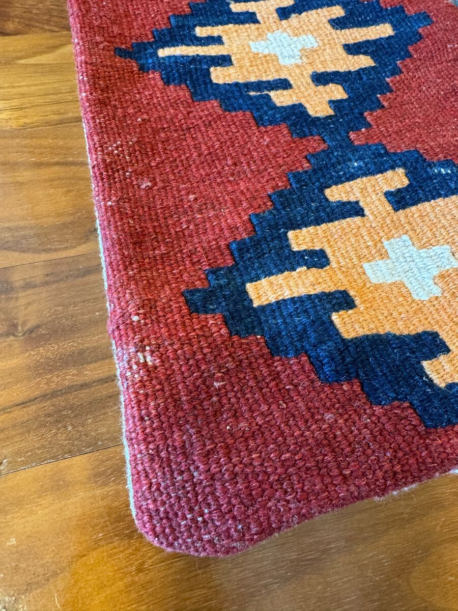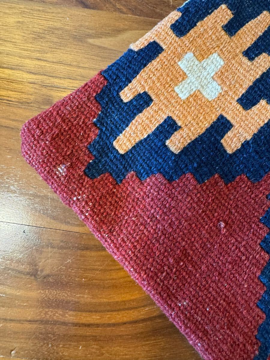 テヘラン (イラン)のキリム屋さんにてお土産用に購入し自宅保管していたクッションカバーです。自然由来の染料で染め上げた羊毛を使用し、手編みで作られています。