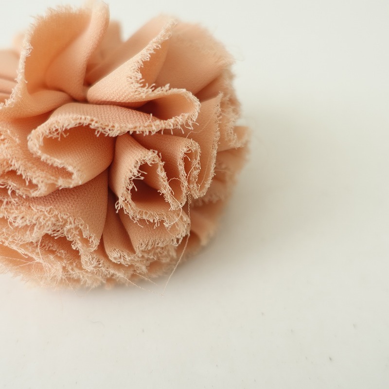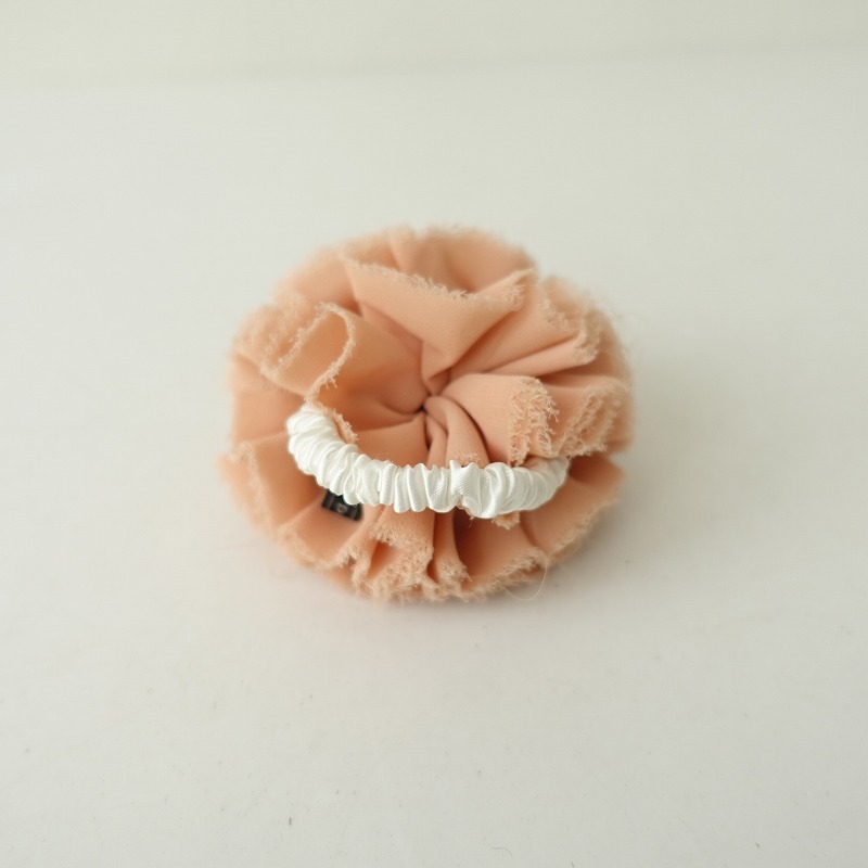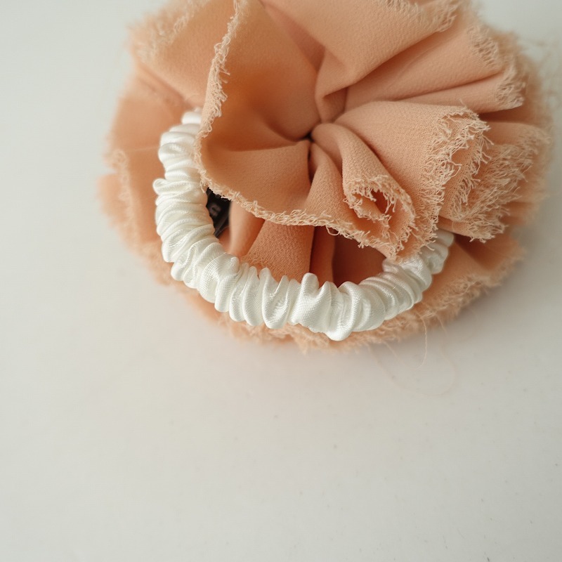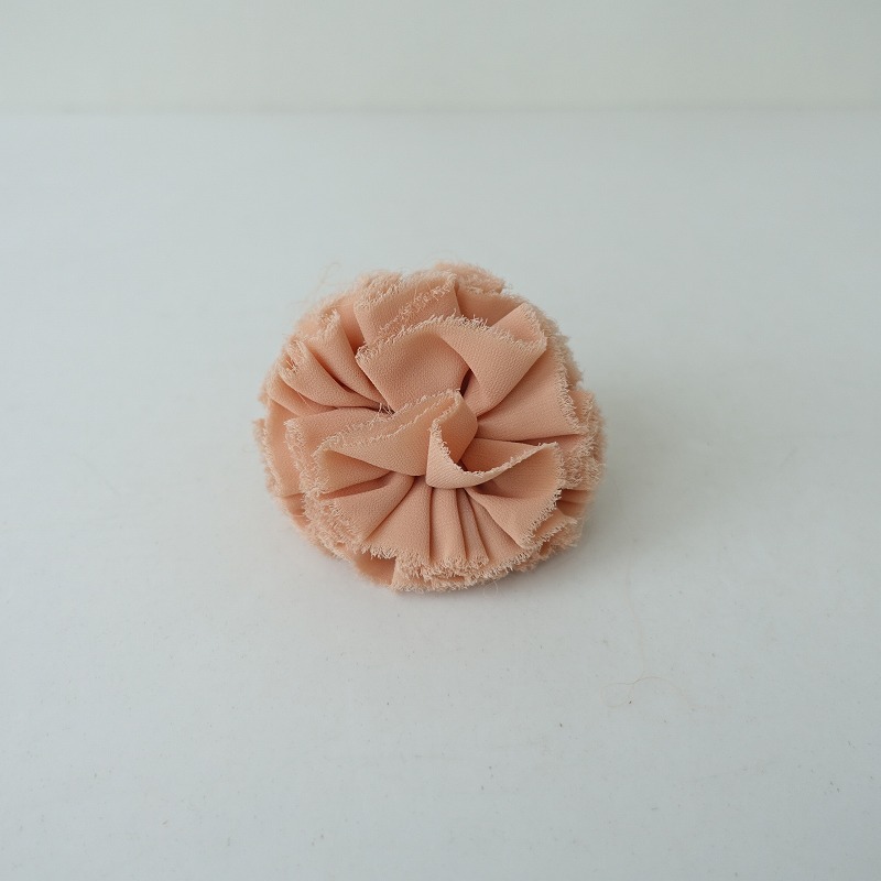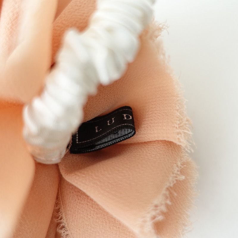 LUDLOWのボンボンゴムです。くすんだピンクのカットオフで仕立てられた大振りのボンボンに、ゴム部分はホワイトのサテン地でくるまれております。 |
