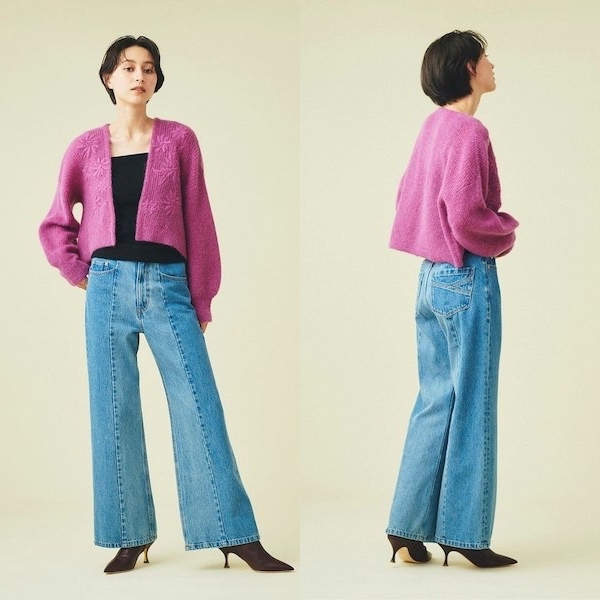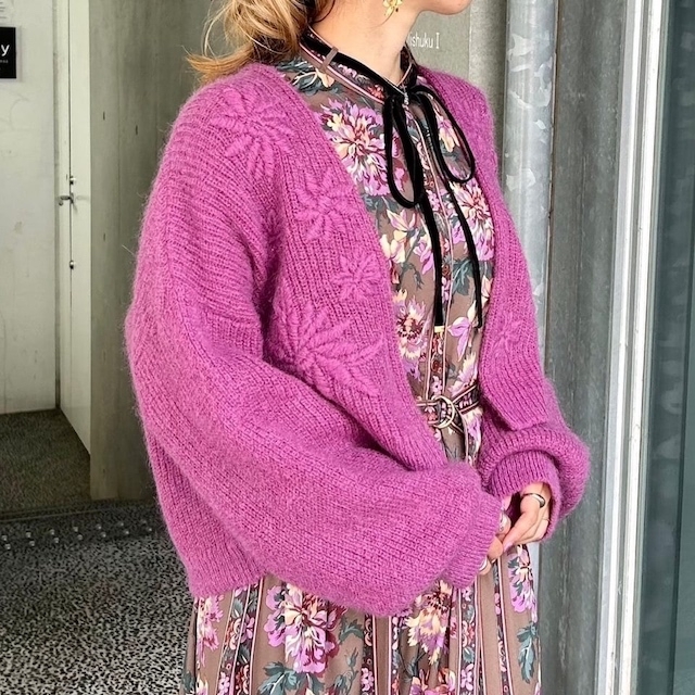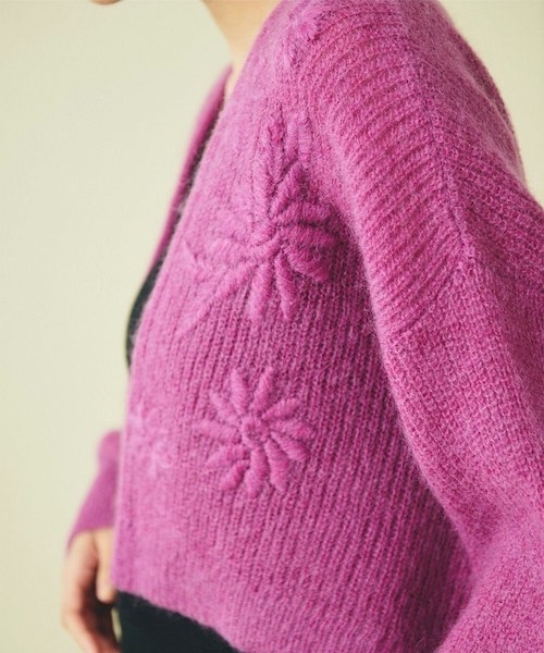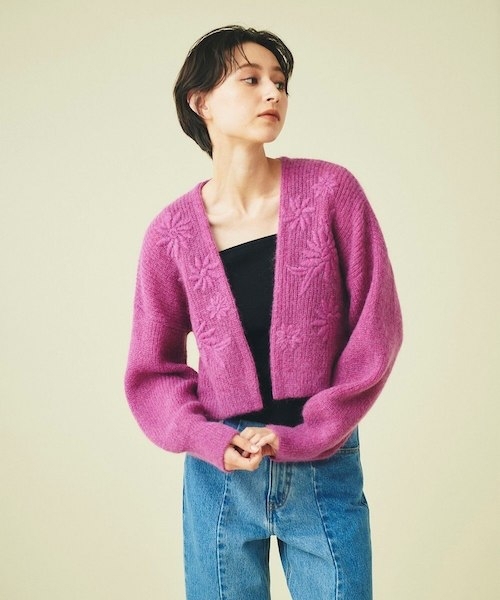 暖かなウールブレンドの糸で編み立てたモヘアカーディガン。 ボタンレスのスマートなルックスに立体的な編み地の同色のフラワーモチーフ自然に溶け込んだ、華美過ぎない上品なデザインです。 ふっくらとしたスリーブシルエットにショート丈の好バランスが特徴。 ワンピースやワイドパンツにさらっと羽織るだけでウエスト位置を高く見せてくれてスタイルアップ効果も◎