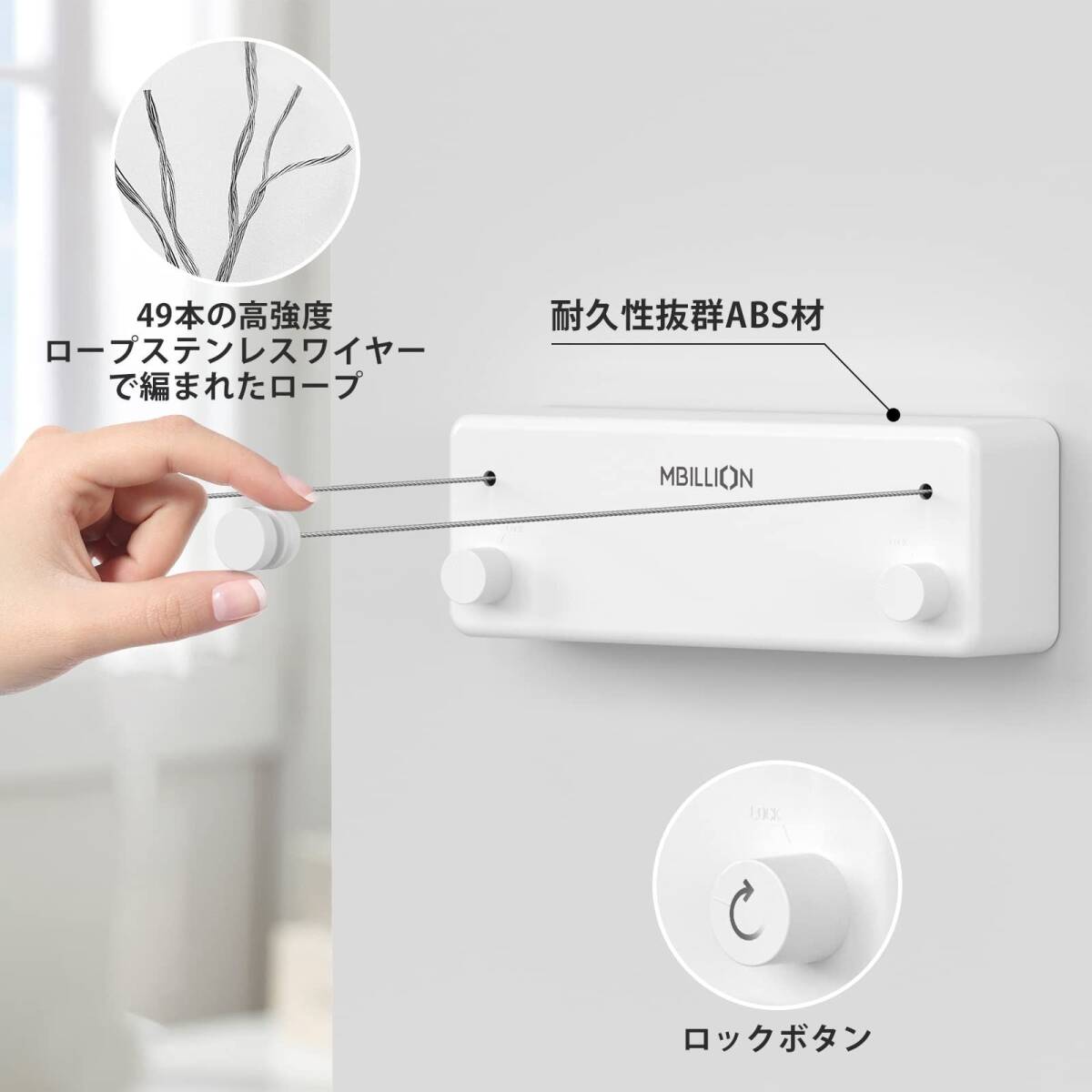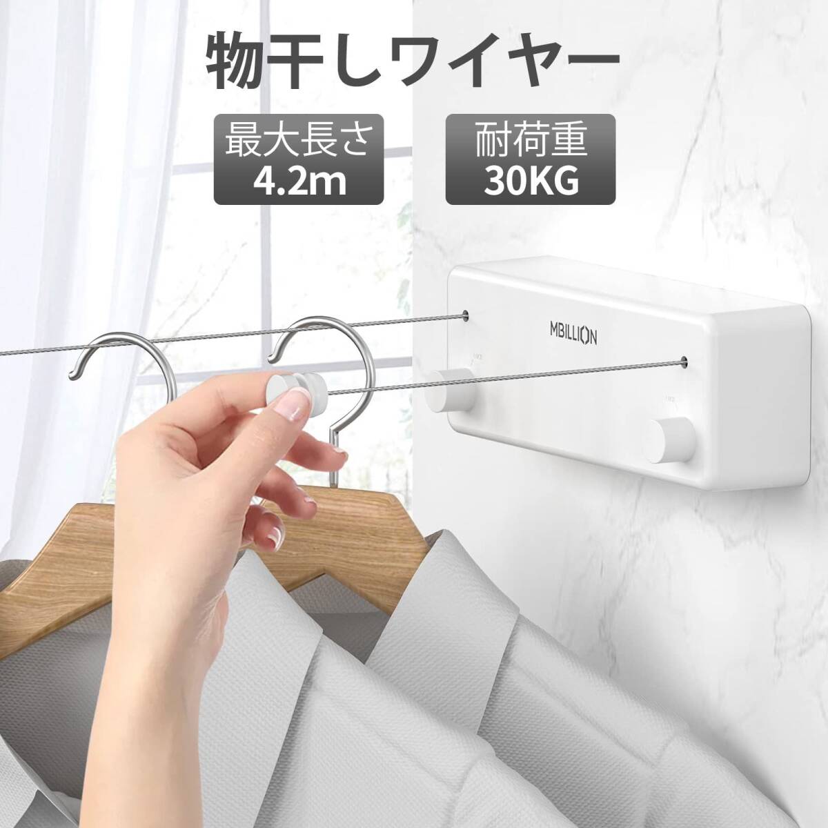 【自動卷き取り式二倍物干し】洗濯物干しワイヤーは最長4.2 メートルまで延び、最大荷重は30kg。 室内物干しワイヤーは自由に伸縮できるので、二つロープがあり、他の物干しワイヤーより二倍干すこ とができる!そして服と布団も一緒に干すこともできて、つまりより多くの収納スペースを提供し、あな たの家のスペースを完全に節約できます!部屋の大きさに応じて必要な長さを調整することができて、 服が落ちる心配はありません!Mbillionの物干しワイヤーは防水と防錆で、他の製品より長持ちします 。