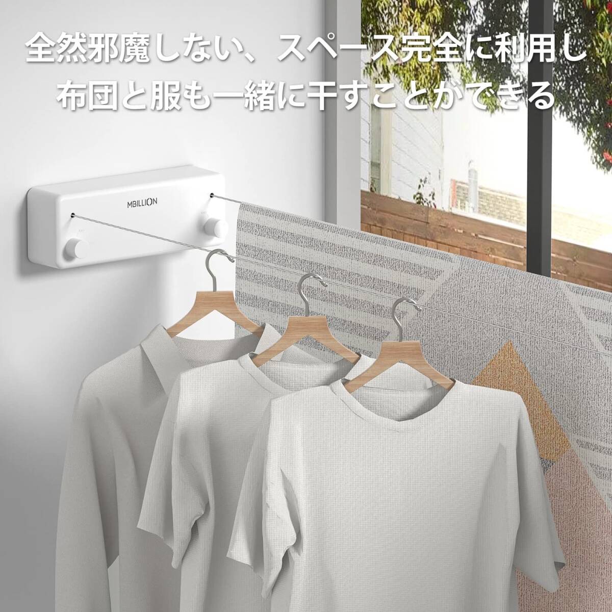 【室内・室外両用が可能】Mbillionの伸縮可能な室内せんたくものほしワイヤーはを使う時だけ引っ張 り出せて普段はすっきり収納。洗濯物干しワイヤーのシンプルな外観はあなたのホームデザインに溶け 込むことができます。室内物干しワイヤーは手動でつまみを引っ込めることで、洗濯ロープの長さを調 節することができ、物干しロープの垂れを防止することができる。雨・雪・花粉・スモッグなどの憂鬱 な天候や梅雨季節と台風の日でも楽に洗濯を干すことができます。
