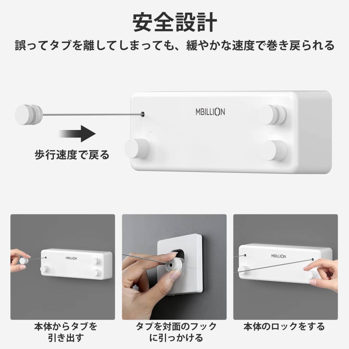 【脱落防止の安全設計】Mbillionの洗濯ロープ本体は高品質ABSプラスチックシェルとアルミニウム合金 ベース、ロープ本体は304ステンレスで作製した。部屋干しラックは超頑丈で操作が簡単で、すべての取 付材が含まれており、組み立てや取り付けが非常に便利である。自動卷き取り式物干しワイヤーは安全 性にも気を配り、不意にタブを離してしまっても、ゆっくりとワイヤーが巻き戻るようデザインしまし た。