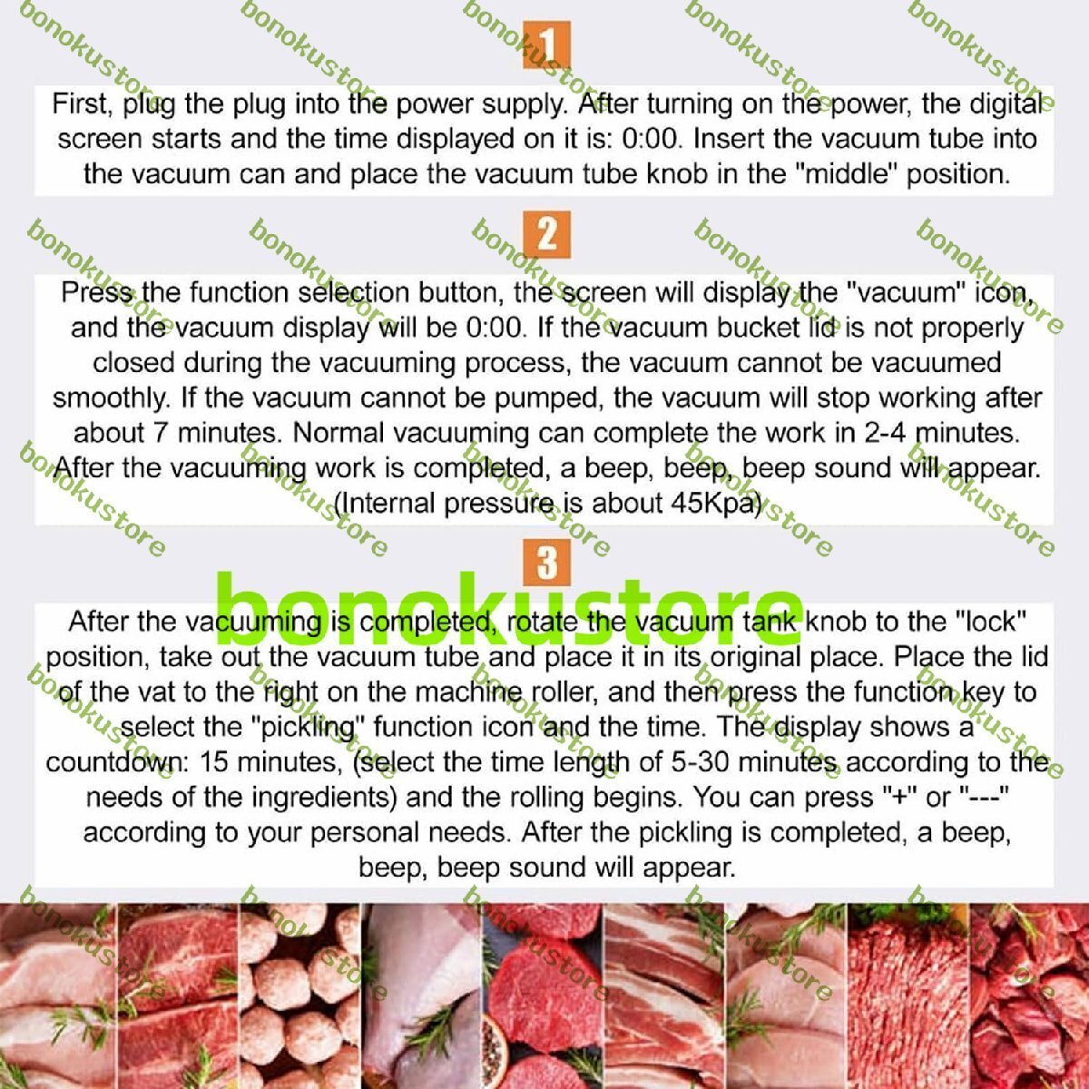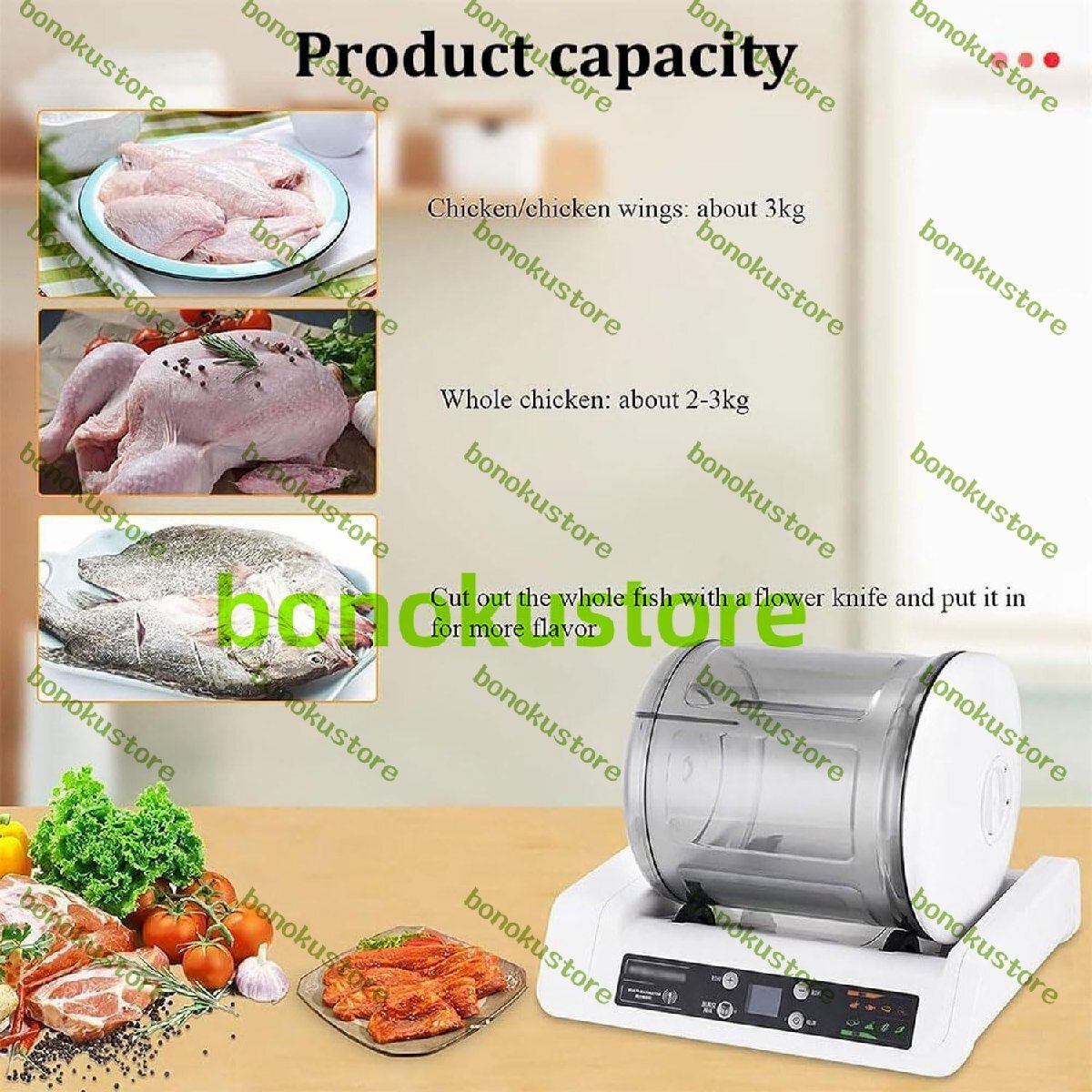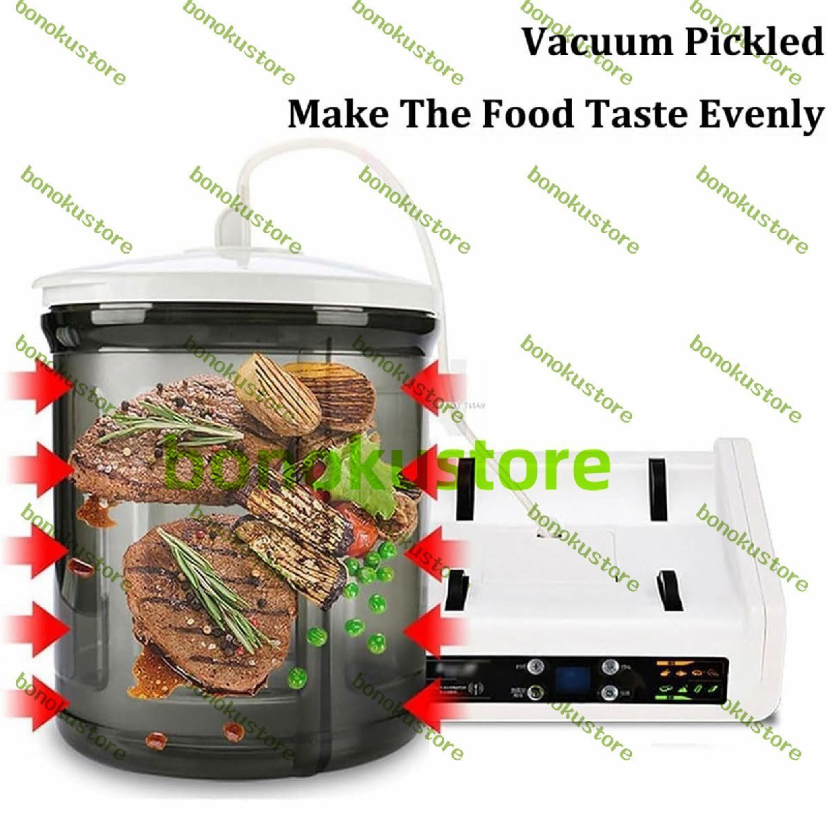 名称: 業務用肉マリネ機 材質:透明で環境に優しいAS 定格電力: 4W 容量: 5リットル 真空内圧:45kpa 定格電圧: 220 V - 60 Hz 製品寸法: 33 x 24 x 25 cm