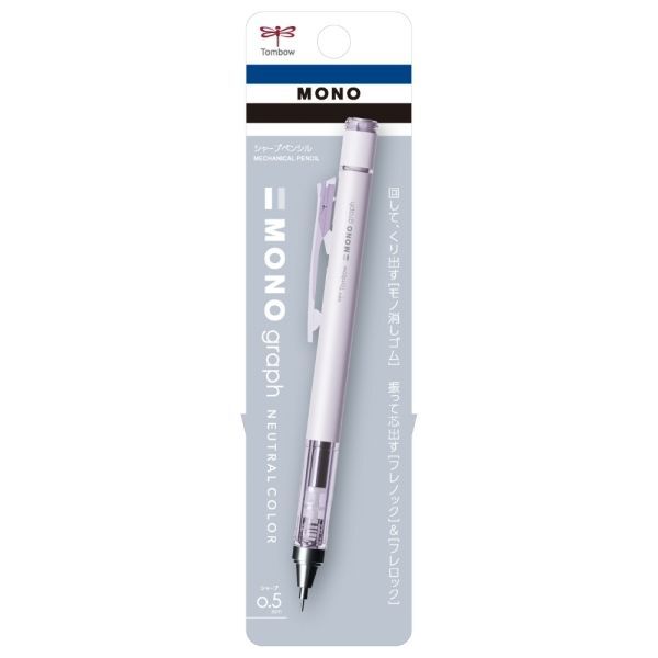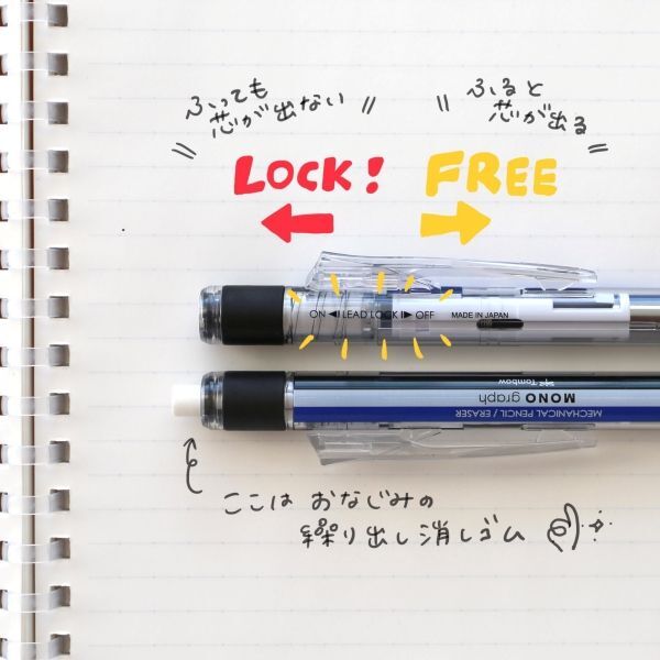 くり出し式モノ消しゴムを搭載し、広視界ロングパイプと指が滑りにくい高密度テクスチャーグリップを採用したMONOブランドデザインのシャープペンシルです。