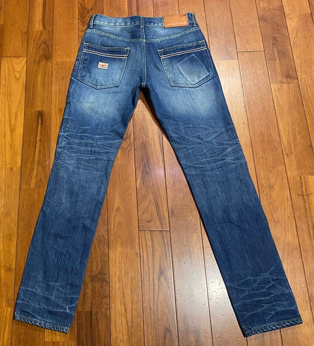 ビルバンのデニム(ジーンズ)、Lot.705です。色はインディゴブルーです。USEDで革パッチ右側のベルト通し下部分補修してますがその他の状態は良いです(10段階中7程度)。生地は綿100%です。革パッチ、ジッパーフライ、裾はチェーンステッチです。正規品です(RUBBER SOUL’INC、韓国製)。サイズはW30でウエストは重ねずに平置きで約76cm、ヒップ約98cm、股上約24cm、股下約80cm、股下15cmのふともも部分約48cm、裾まわり約32cm、重量約600gです。発送はゆうパケットポストになります。