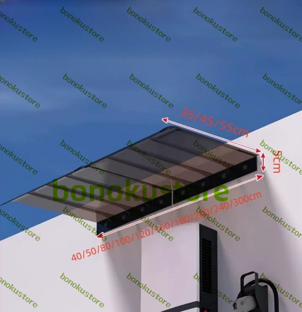 厚さ3mm、耐荷重100kg、耐候性に優れ、-45℃の低温から120℃の高温まで安定し、変形せず、あらゆる天候、暴風雨、吹雪に耐える。パティオ雨宿りは凹型デザインにアップグレードされ。より広い玄関、窓、通路をカバーします。十分な仕様があり、キャノピーをスプライスしてカバーエリアを拡大することができ、ほとんどの窓や出入り口にきれいな地面を提供し、人間化されたデザインで、取り付けが簡単で、取り付け金具はパッケージに含まれています。サイズ:40~200cm , 50~200cm , 60~300cmパネル材質:PCシートパッケージは以下を含みます:1 * オーニングキャノピー組み立て用のすべての付属品アフターサービスカスタマーエクスペリエンスを重視しています。ご不明な点がございましたら、時間内にお問い合わせください。喜んでサービスを提供いたします。