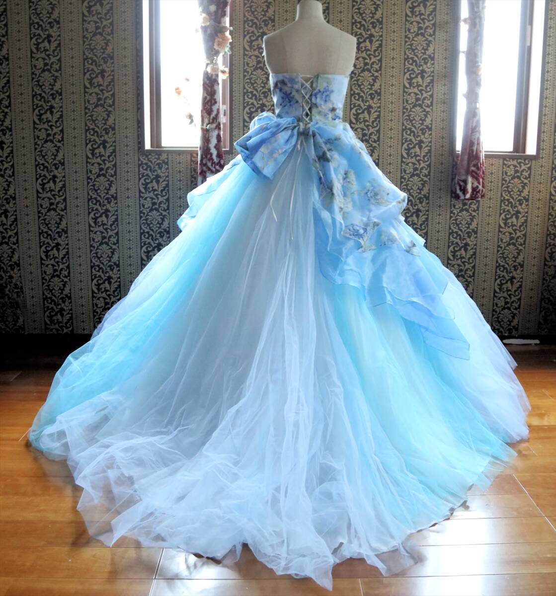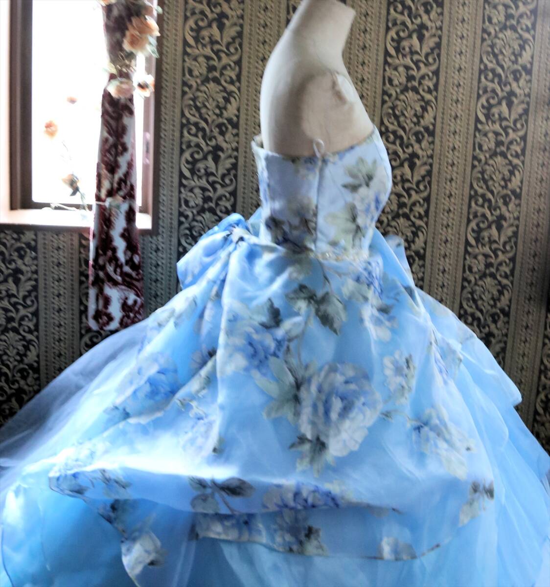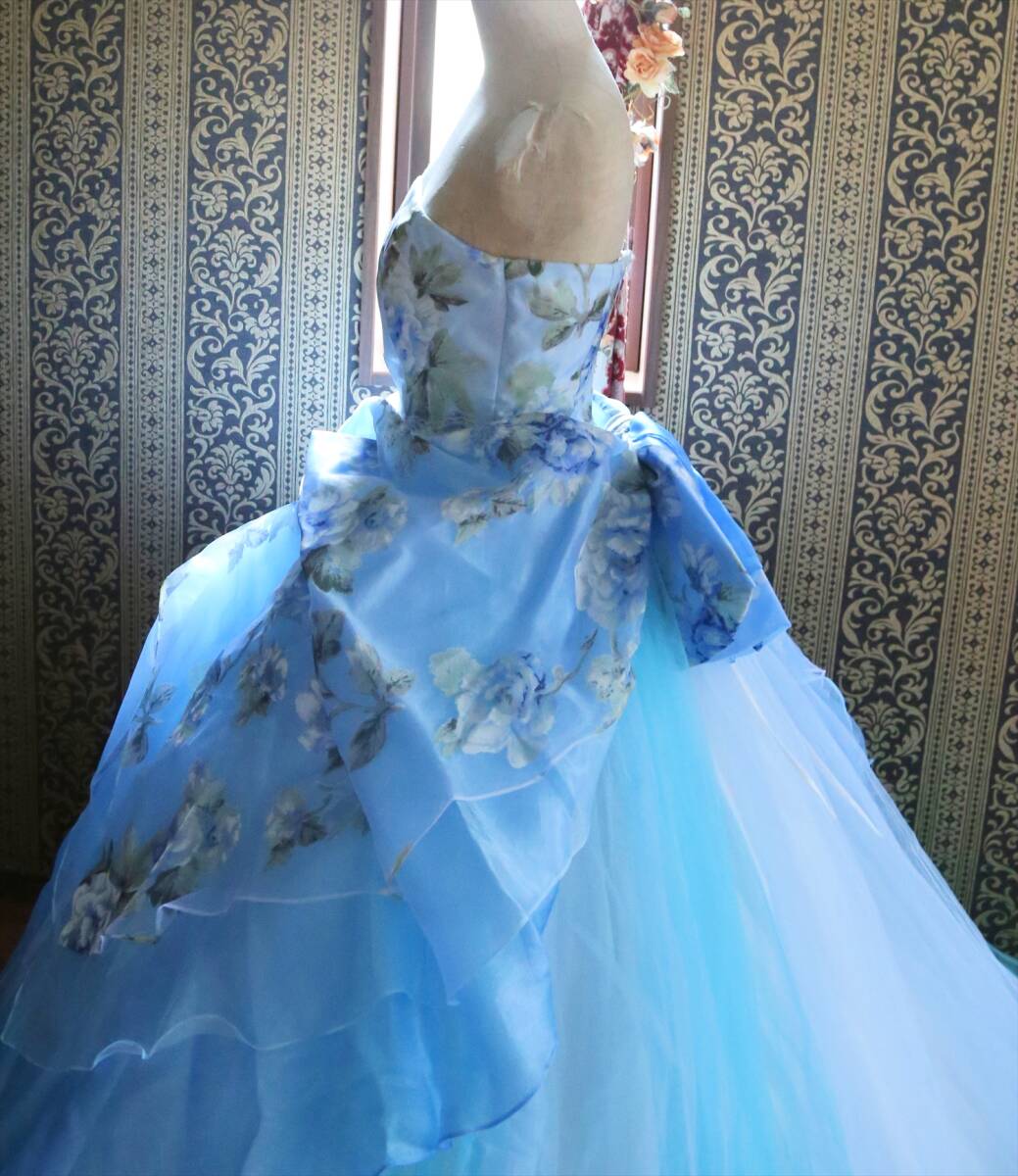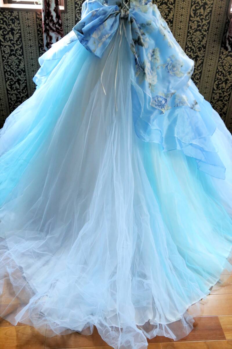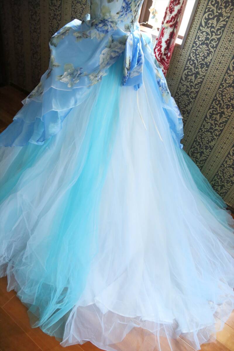 水色系の花柄高級ウエディングドレス7号9号11号S~Lサイズカラードレス編み上げ調節可能