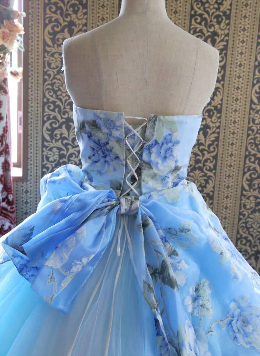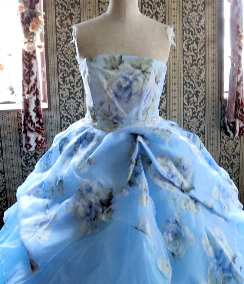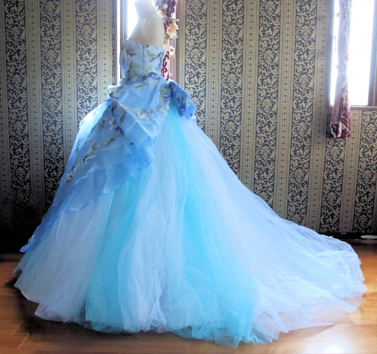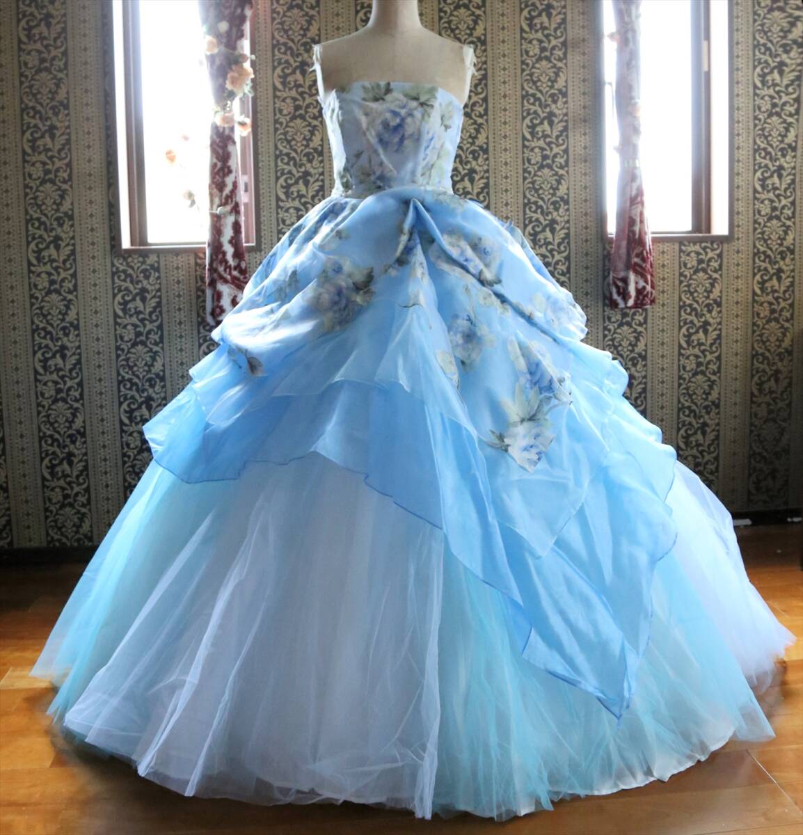 水色系の花柄高級ウエディングドレス7号9号11号S~Lサイズカラードレス編み上げ調節可能