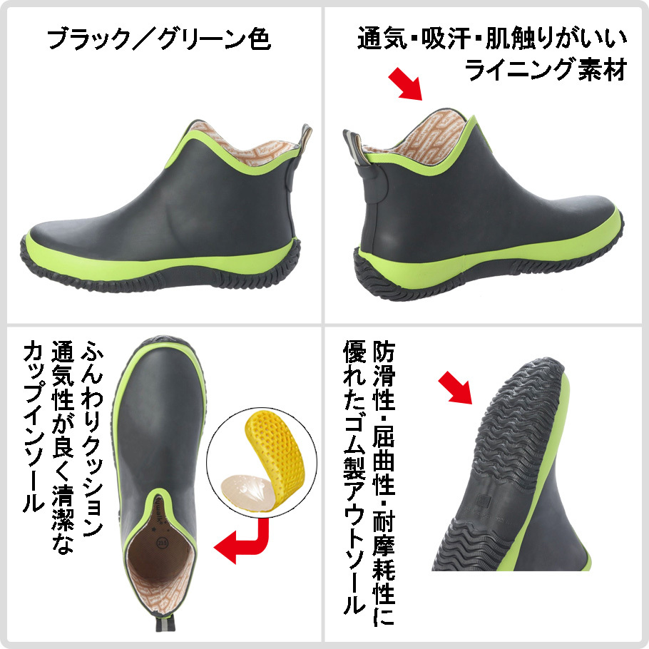訳あり ショート レインブーツ レインシューズ 天然ゴム 完全防水 防滑底 耐候性 カップインソール メンズ レディース 20089-blk-grn-245