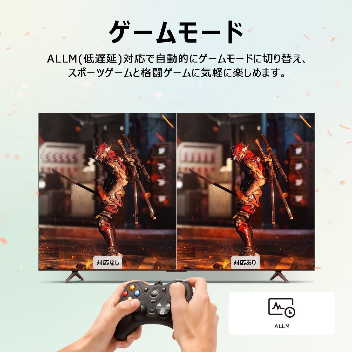 • 【ALLM(自動低遅延)対応】入力機器からのゲームプレイ映像情報を検出次第、ALLM(自動低遅延)対応で自動的にゲームモードに切り替えます。映像信号を受信後、表示遅延を軽減し、映像をストレスなく表現します。映像遅延時間が4ms※まで短縮されます。スポーツゲームや格闘ゲームなどを気軽に楽しみいただけます。※HDMI 1080p/60Hz 入力時、HDMI 4K/60Hz入力時の映像入力ラグが約8ms。