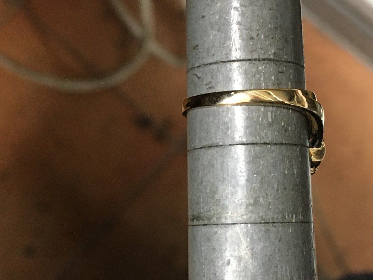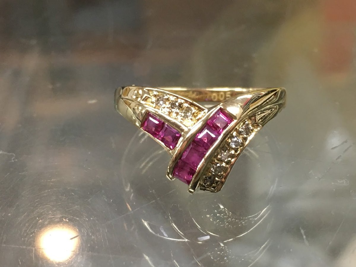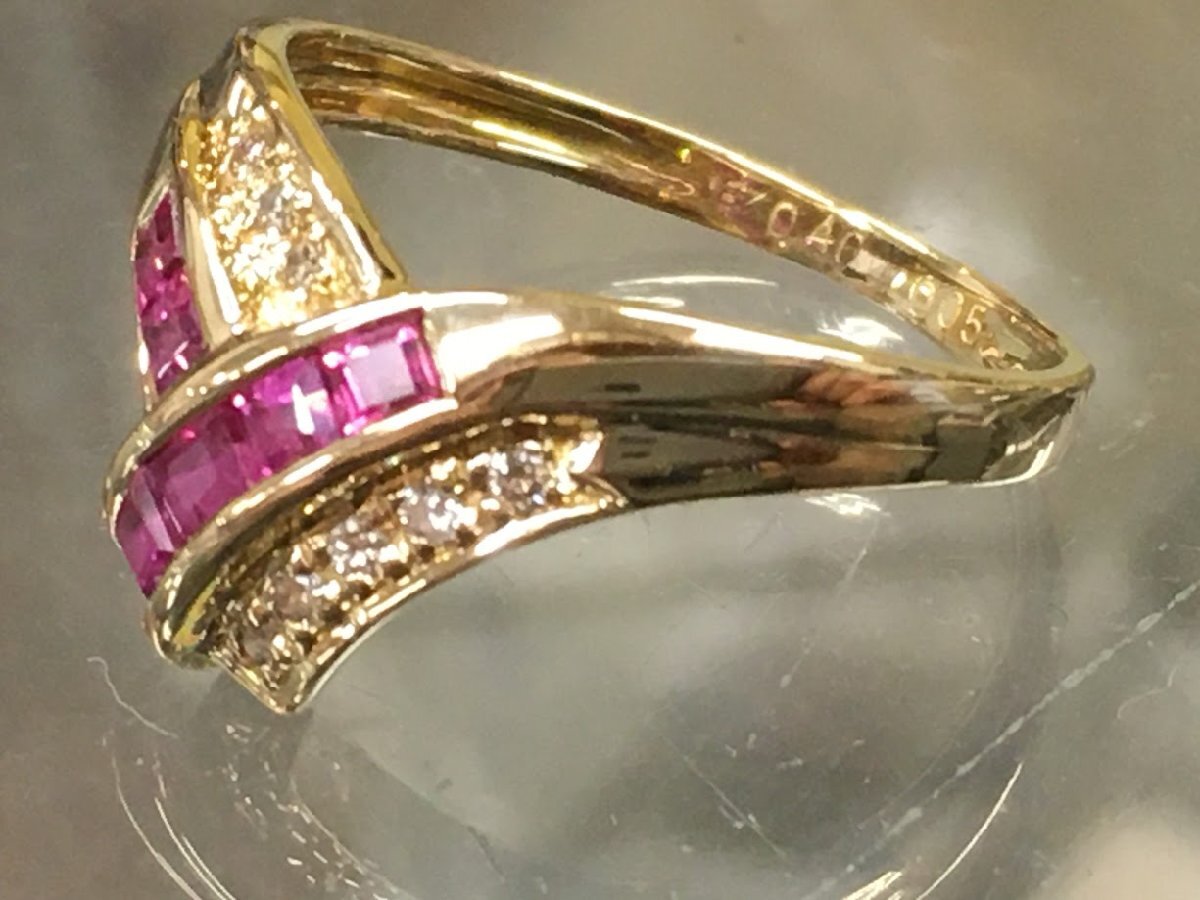 土台は18金無垢。最大幅10.0mm、ルビーは0.4ct、ダイヤモンドは0.05ct。総重量は約2.15g。