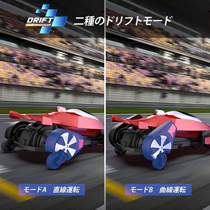 【二種の運転モード】モードA:直線運転。このモードに、この製品は普通のラジコンカーと同じで、前進、後退、左折、右折が可能です。モードB:曲線運転。このモードに、スタントカーのようにドリフトして、回転できます。